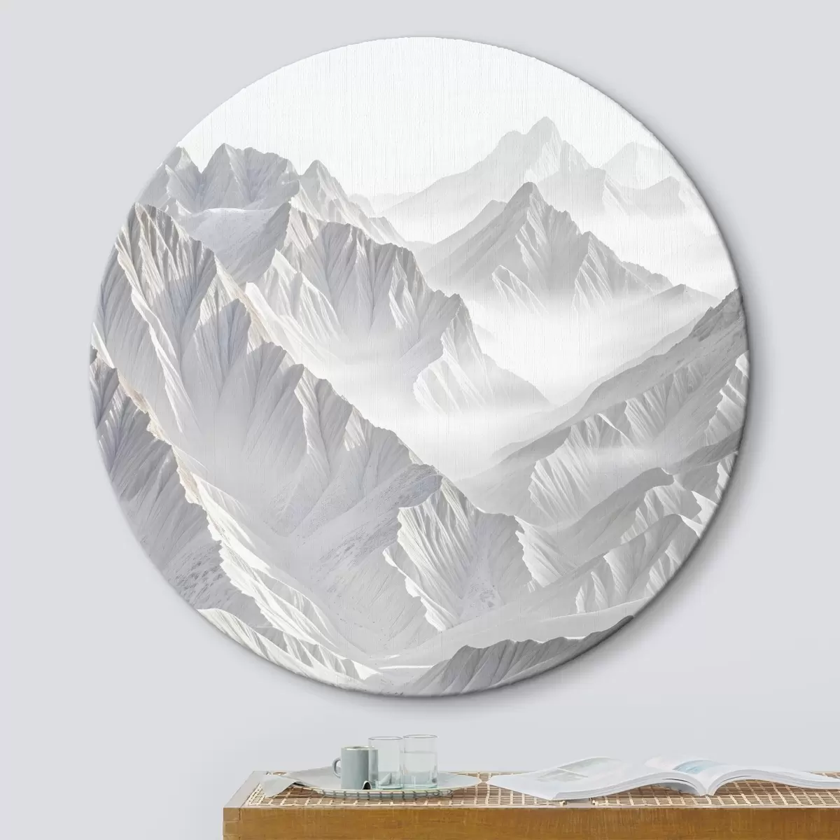 Ronde schilderijen Besneeuwde minimalistische bergtoppen in een mistig landschap Nr r41083