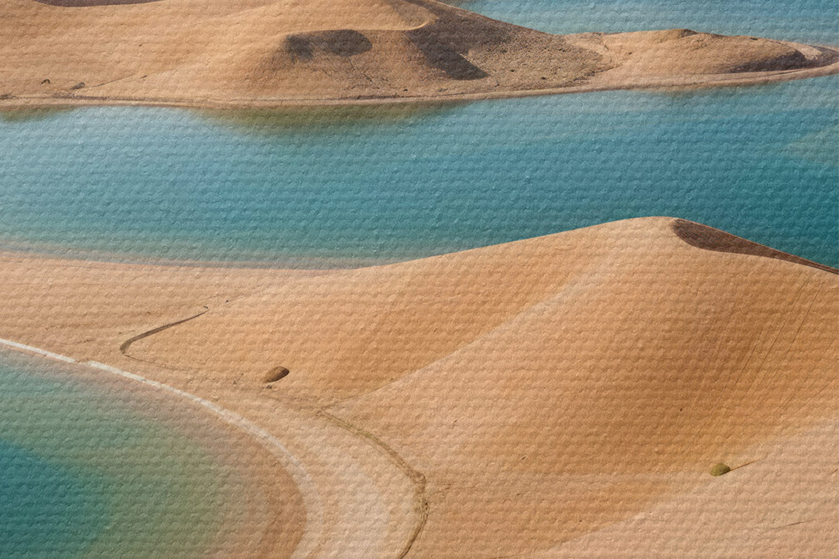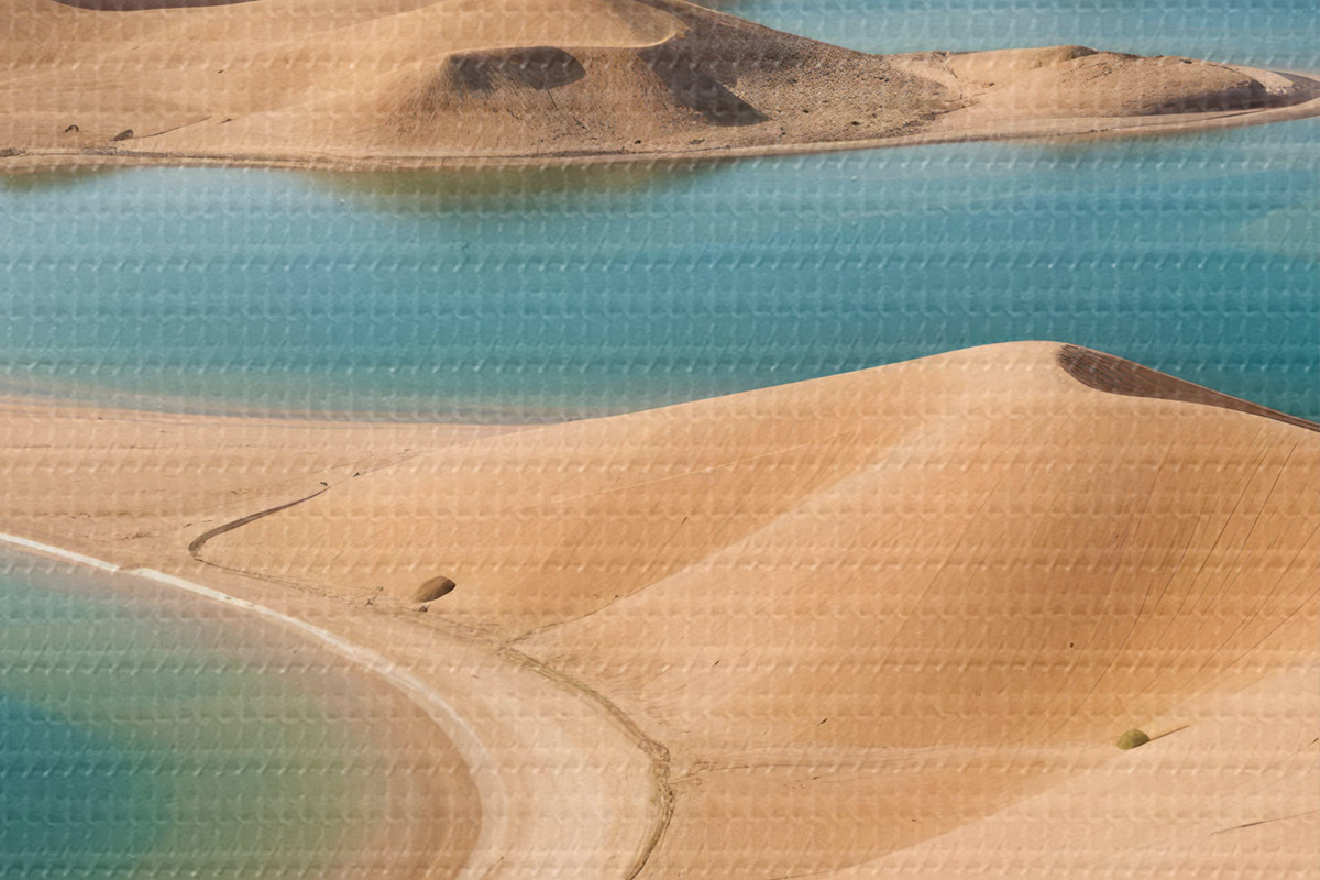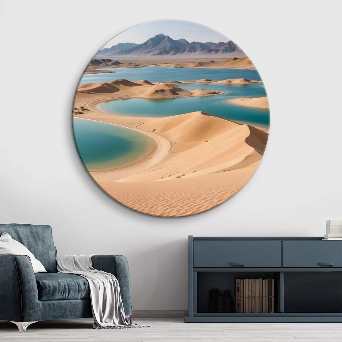 Ronde schilderijen Een uitgestrekt woestijnlandschap met glooiende duinen en turquoise meren, omringd door ruige bergen Nr r41087