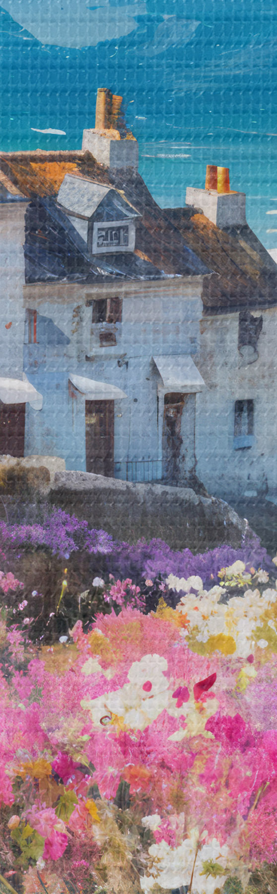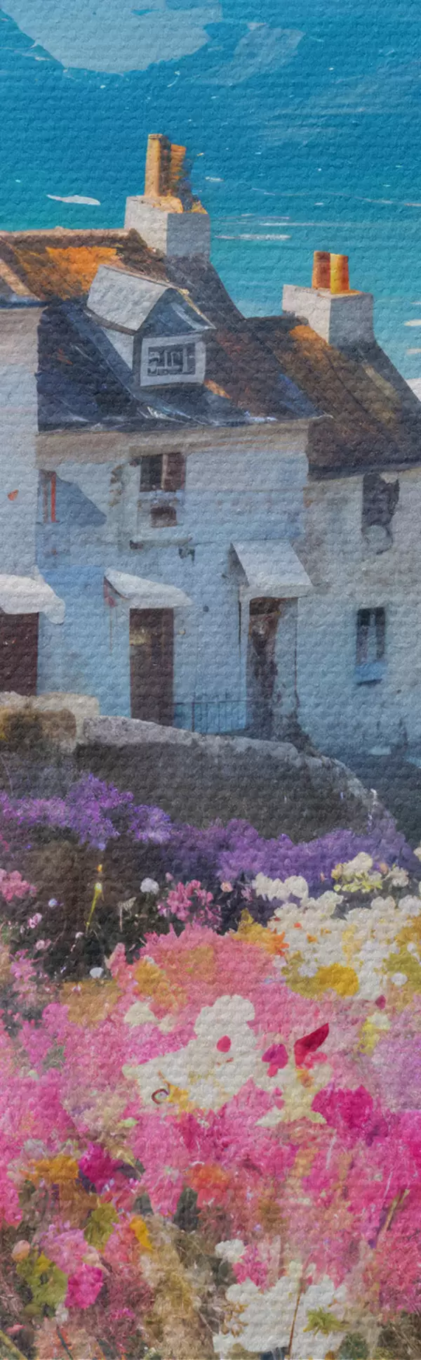 Ronde schilderijen Een kleurrijk olieverfschilderij van een stadje aan zee met witte huizen en een levendige bloementuin op de voorgrond Nr r41090