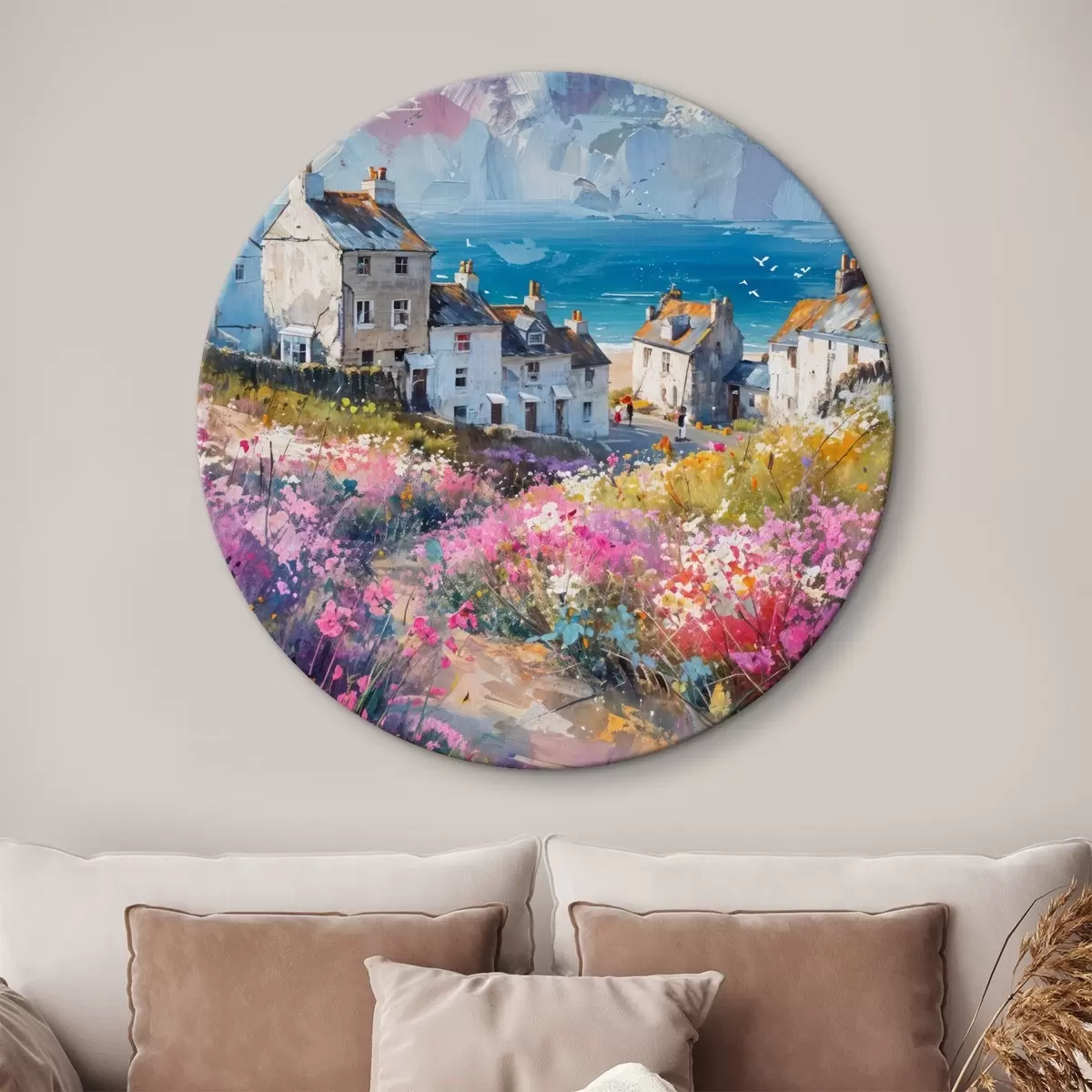 Ronde schilderijen Een kleurrijk olieverfschilderij van een stadje aan zee met witte huizen en een levendige bloementuin op de voorgrond r41090