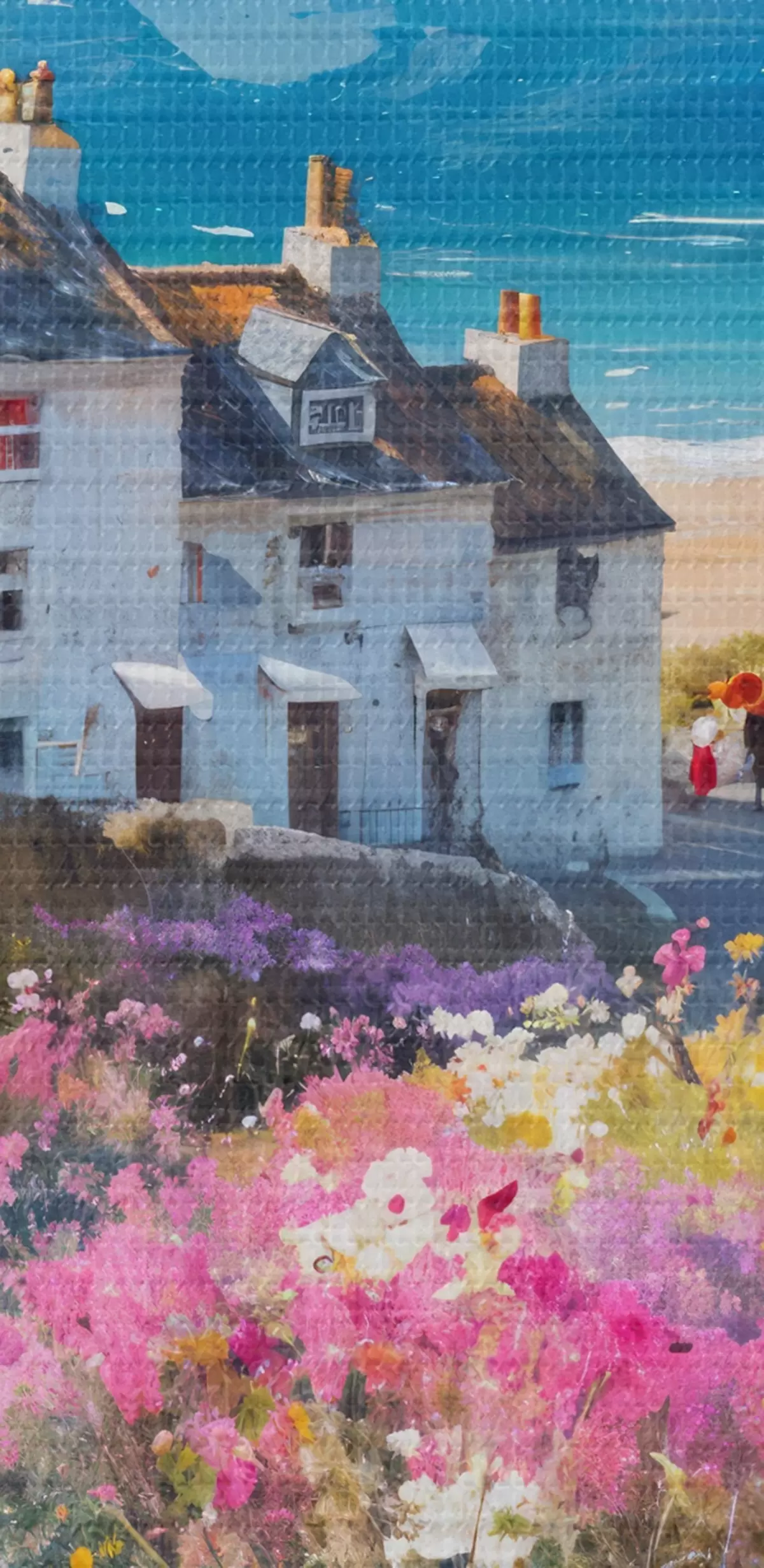 Ronde schilderijen Een kleurrijk olieverfschilderij van een stadje aan zee met witte huizen en een levendige bloementuin op de voorgrond Nr r41090