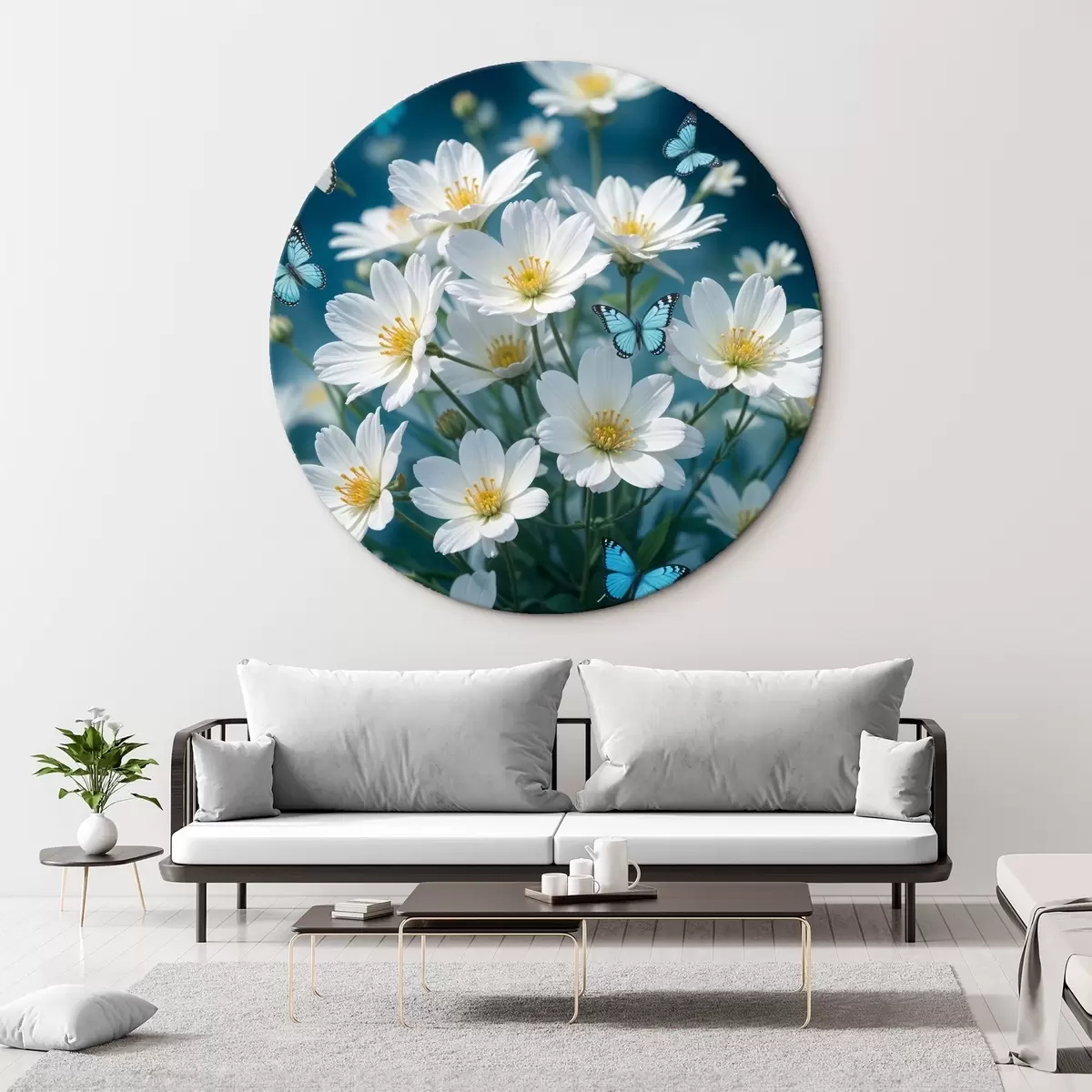 Ronde schilderijen Een veld van witte margriet bloemen met blauwe vlinders fladderen tussen hen op een wazige blauwe achtergrond Nr r41096