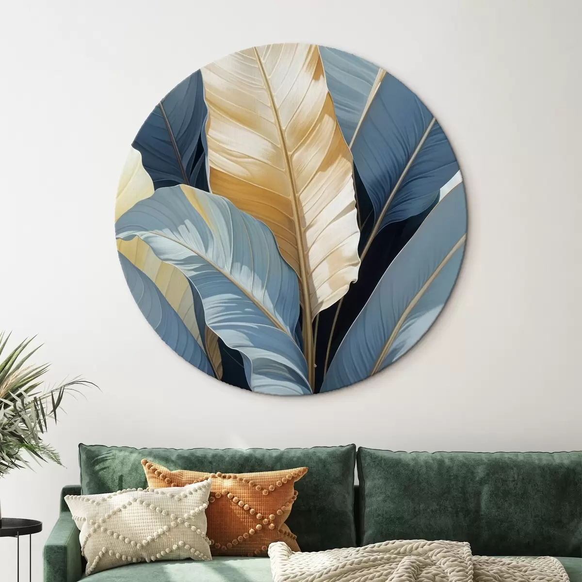 Ronde schilderijen Tropische bladeren met blauwe en gele tinten, grote palm- of bananenbladeren met een weelderige natuurlijke achtergrond Nr r41097