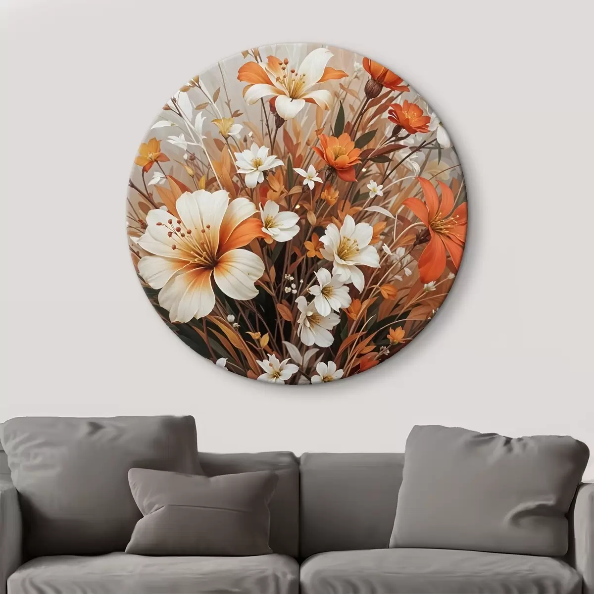 Ronde schilderijen Een levendig boeket van oranje en witte bloemen, waaronder lelies en andere delicate bloemen Nr r41099
