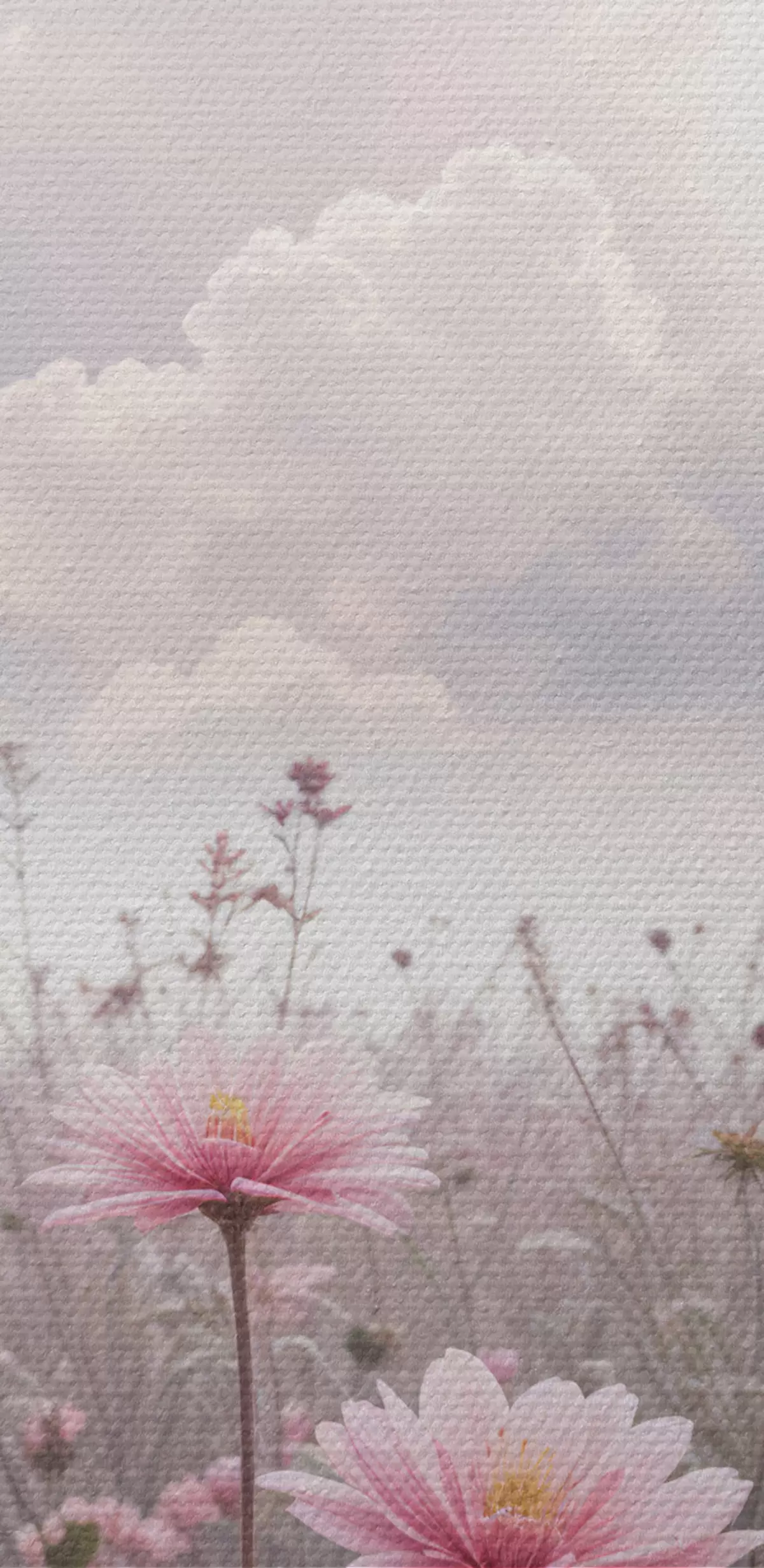 Ronde schilderijen Een veld met roze margrietbloemen tegen een bewolkte lucht Nr r41102