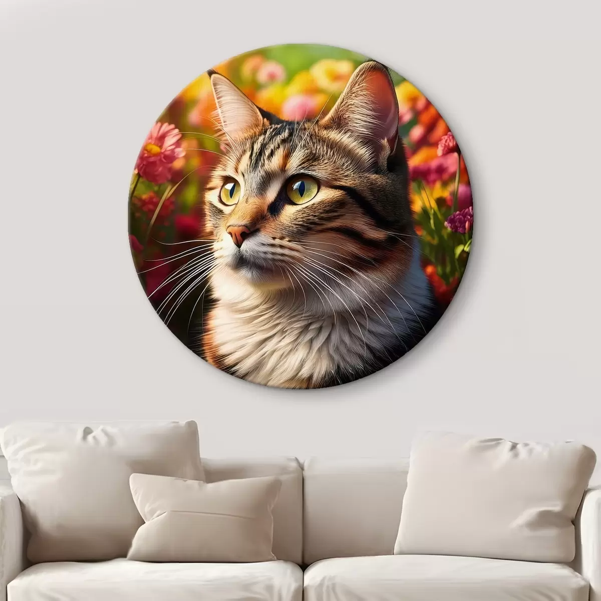 Ronde schilderijen grote kat, kattenportret, kat en bloemen Nr r41106