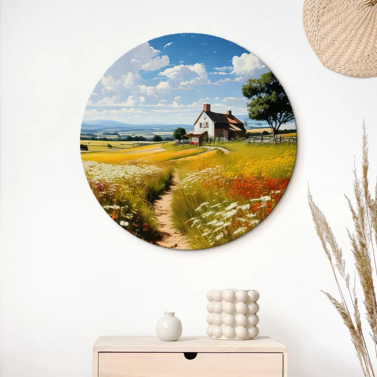 Ronde schilderijen pad in een bloeiend veld en huis r41109