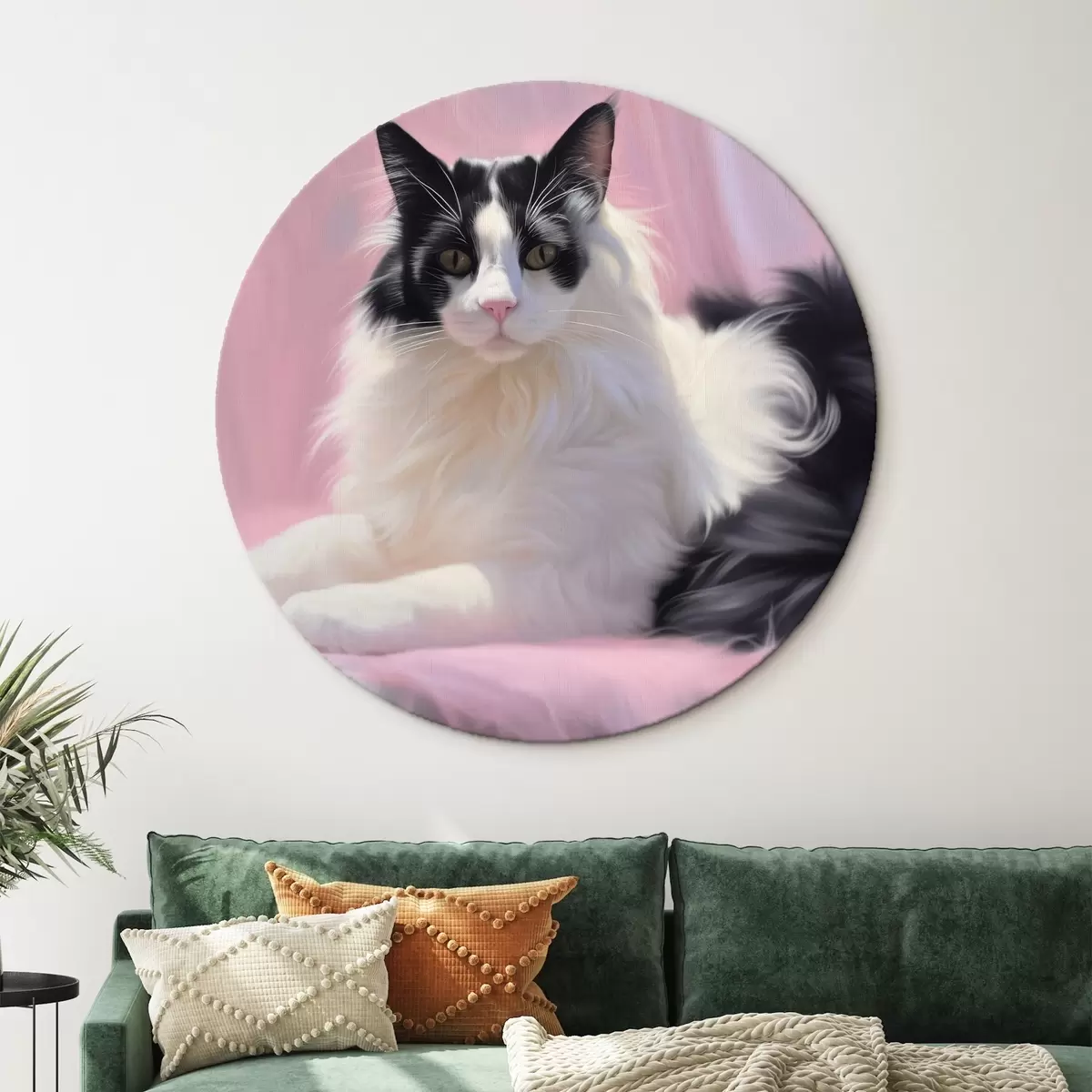 Ronde schilderijen Kat, zachte achtergrond, witte en zwarte kat Nr r41182