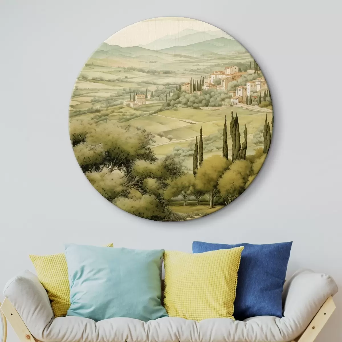 Ronde schilderijen Toscaanse landschappen, aquarel, boho-stijl Nr r41220