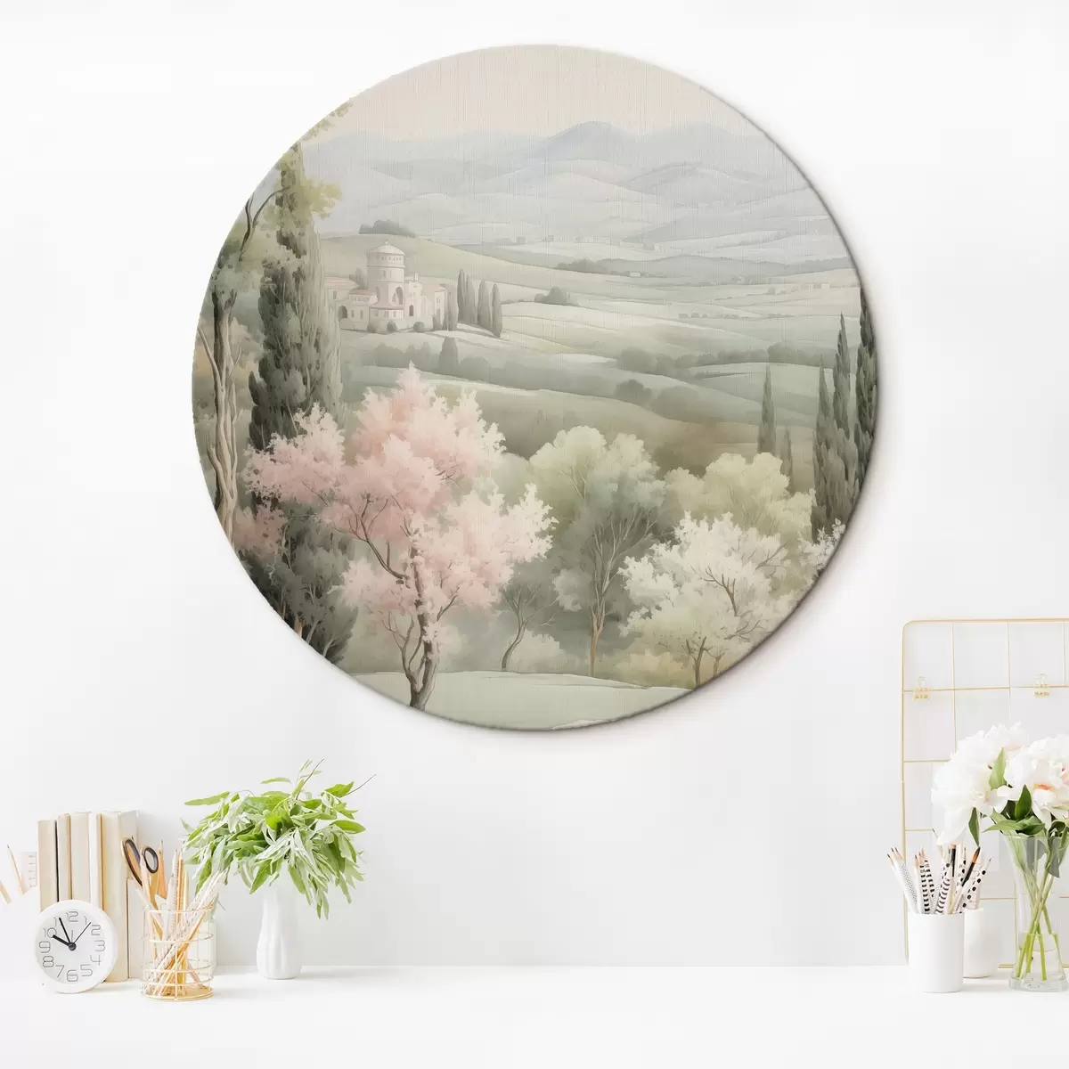 Ronde schilderijen Aquarel natuur, delicate kleuren, rozen, bomen, groene heuvels Nr r41223