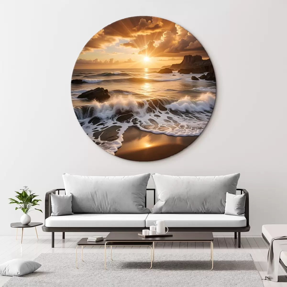 Ronde schilderijen Dramatische zonsondergang boven de rotsachtige kust, met beukende golven en dramatische wolken in de lucht Nr r41245