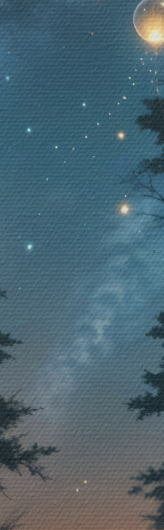 Ronde schilderijen Magisch bos bij nacht met gele lichtbollen en vuurvliegjes die tussen de bomen zweven en een grillige sfeer creëren Nr r41259