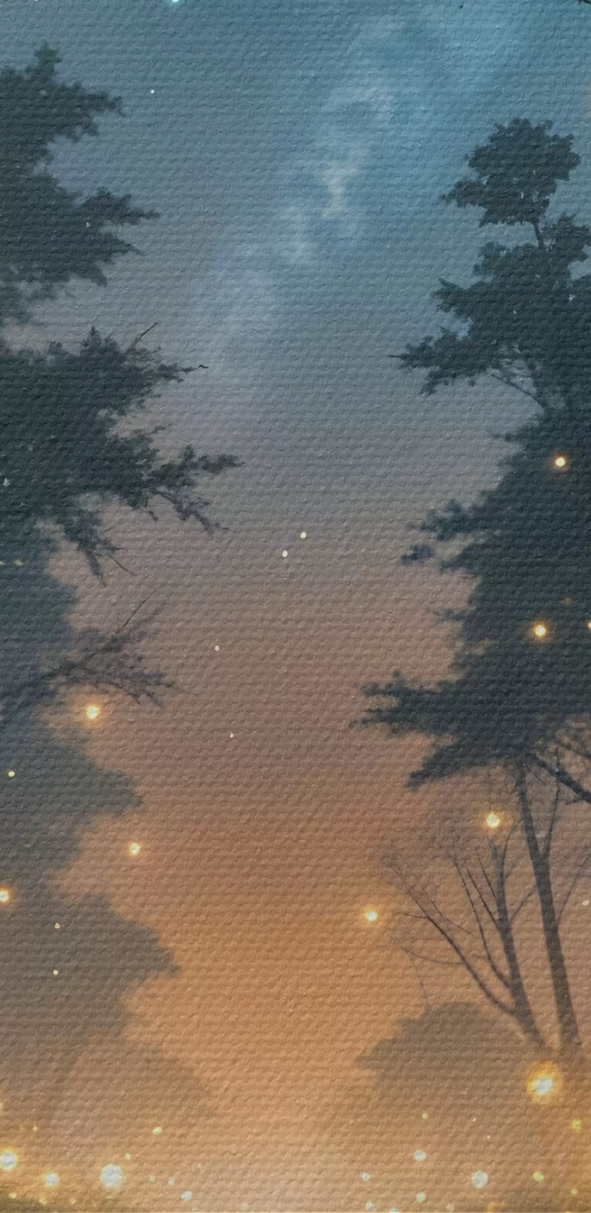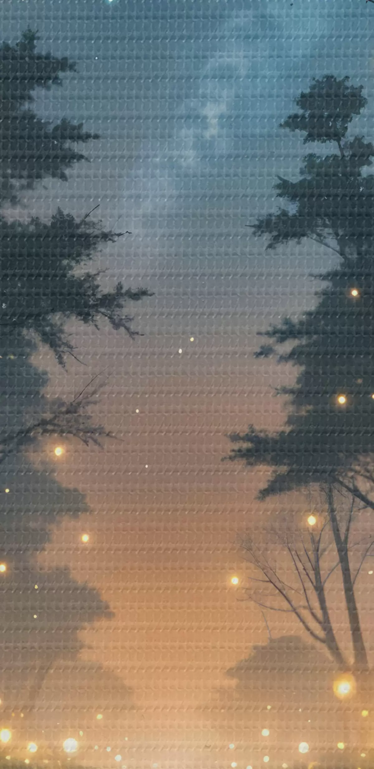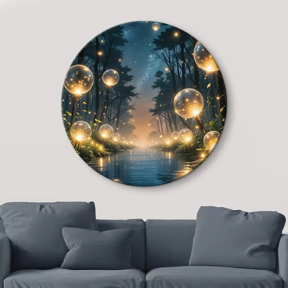 Ronde schilderijen Magisch bos bij nacht met gele lichtbollen en vuurvliegjes die tussen de bomen zweven en een grillige sfeer creëren Nr r41259