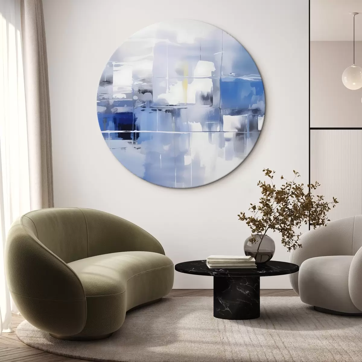 Ronde schilderijen Moderne abstractie in blauw-, wit- en grijstinten met vage lijnen en vormen Nr r41269