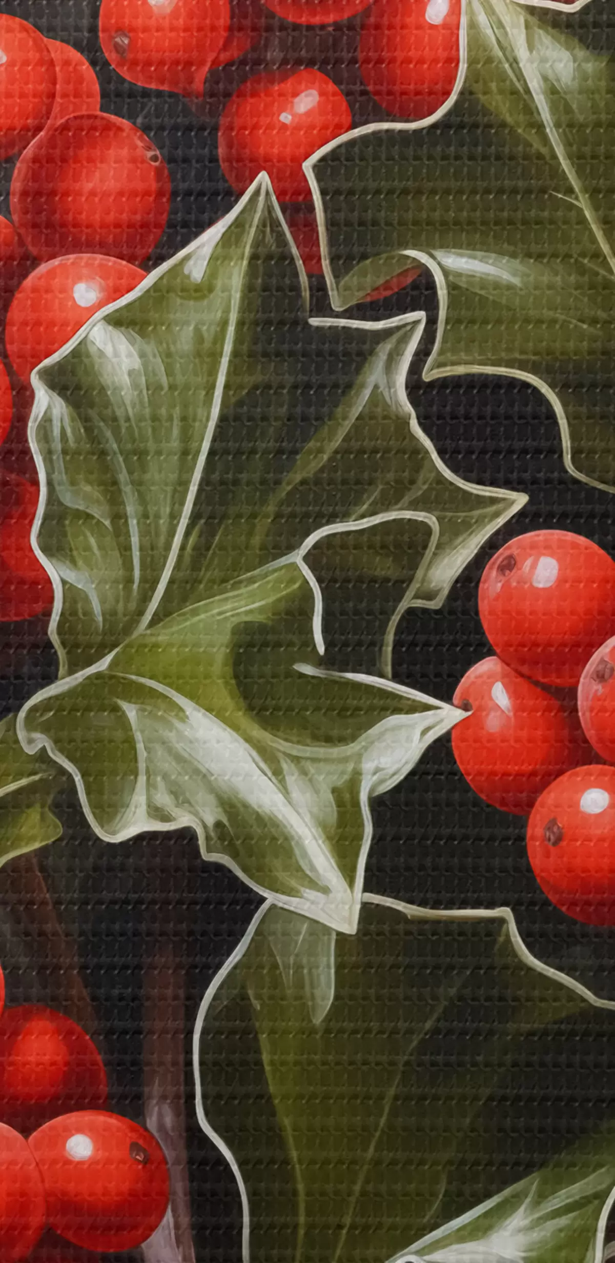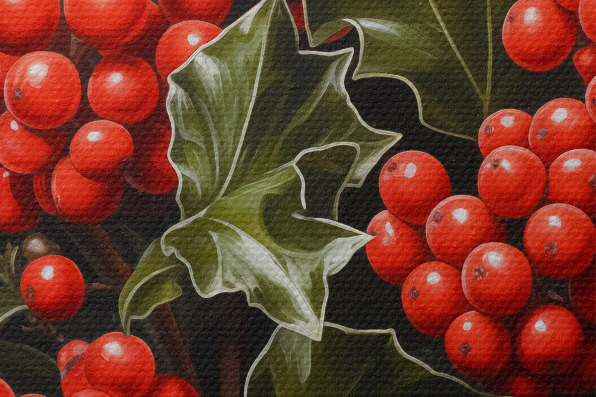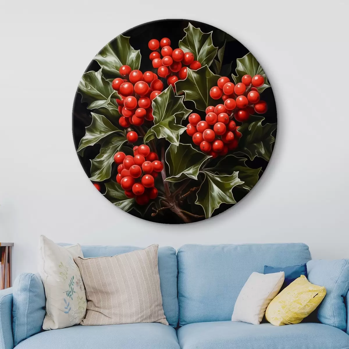 Ronde schilderijen Hulstbessen en bladeren op een donkere achtergrond Nr r41273