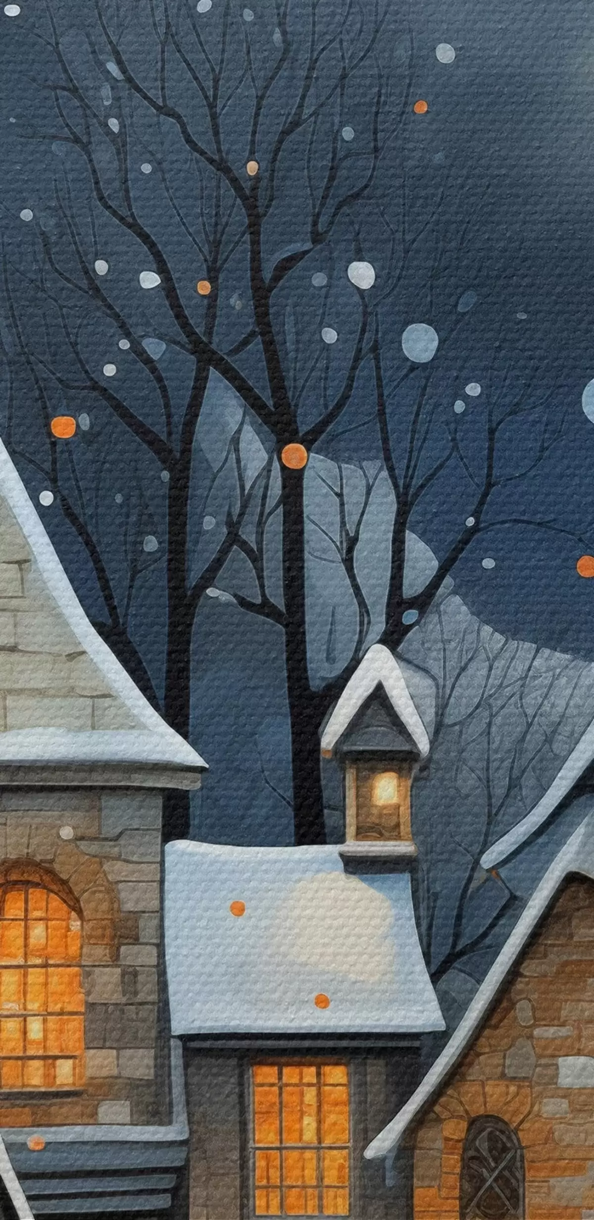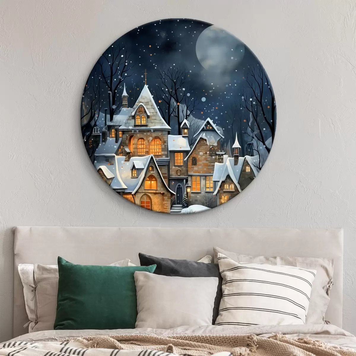 Ronde schilderijen Huizen in de sneeuw tegen de sterrenhemel Nr r41276