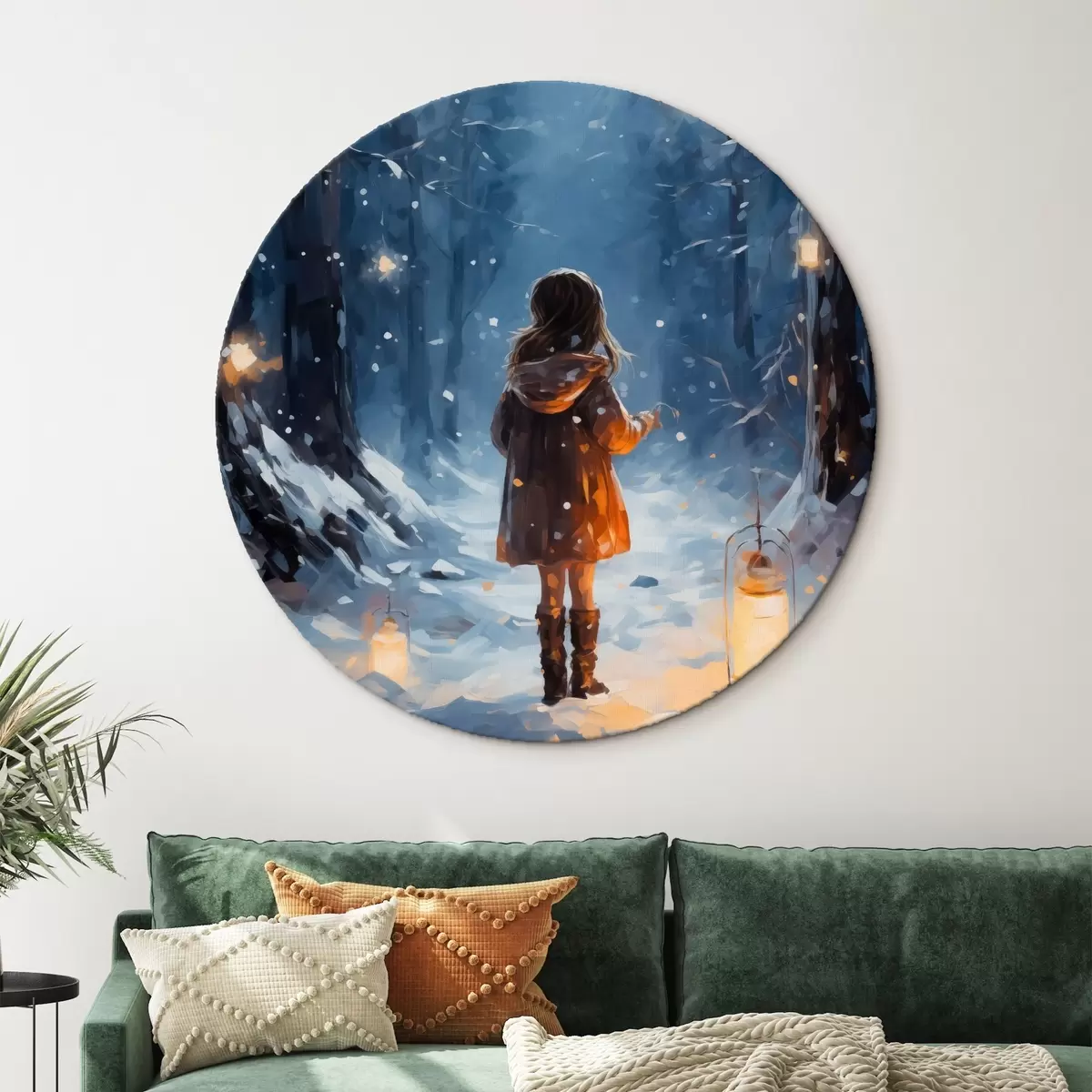 Ronde schilderijen Meisje in het nachtelijke winterbos tussen bomen en lantaarns r41277