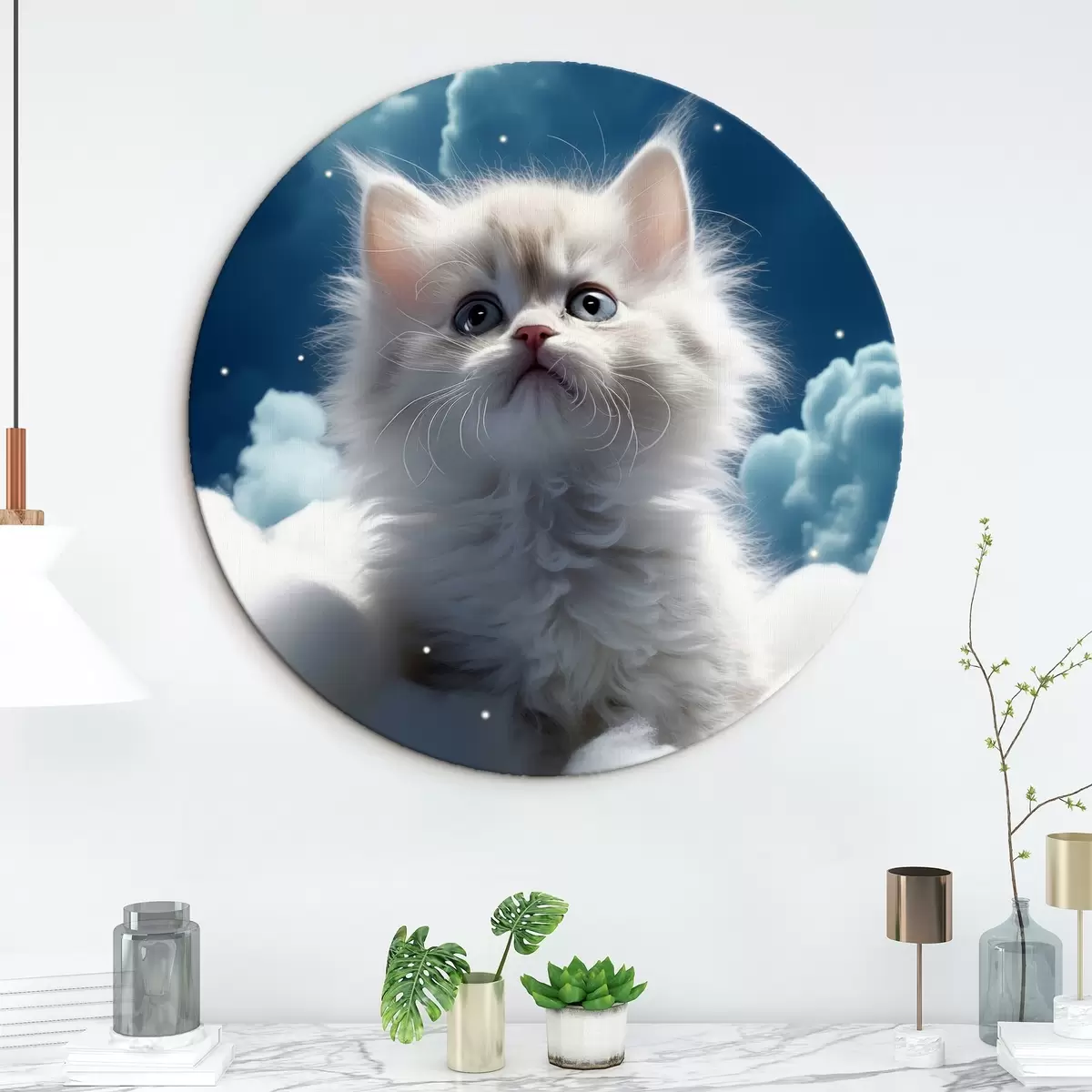 Ronde schilderijen Een wit pluizig katje in de lucht zit op een wolk Nr r41279