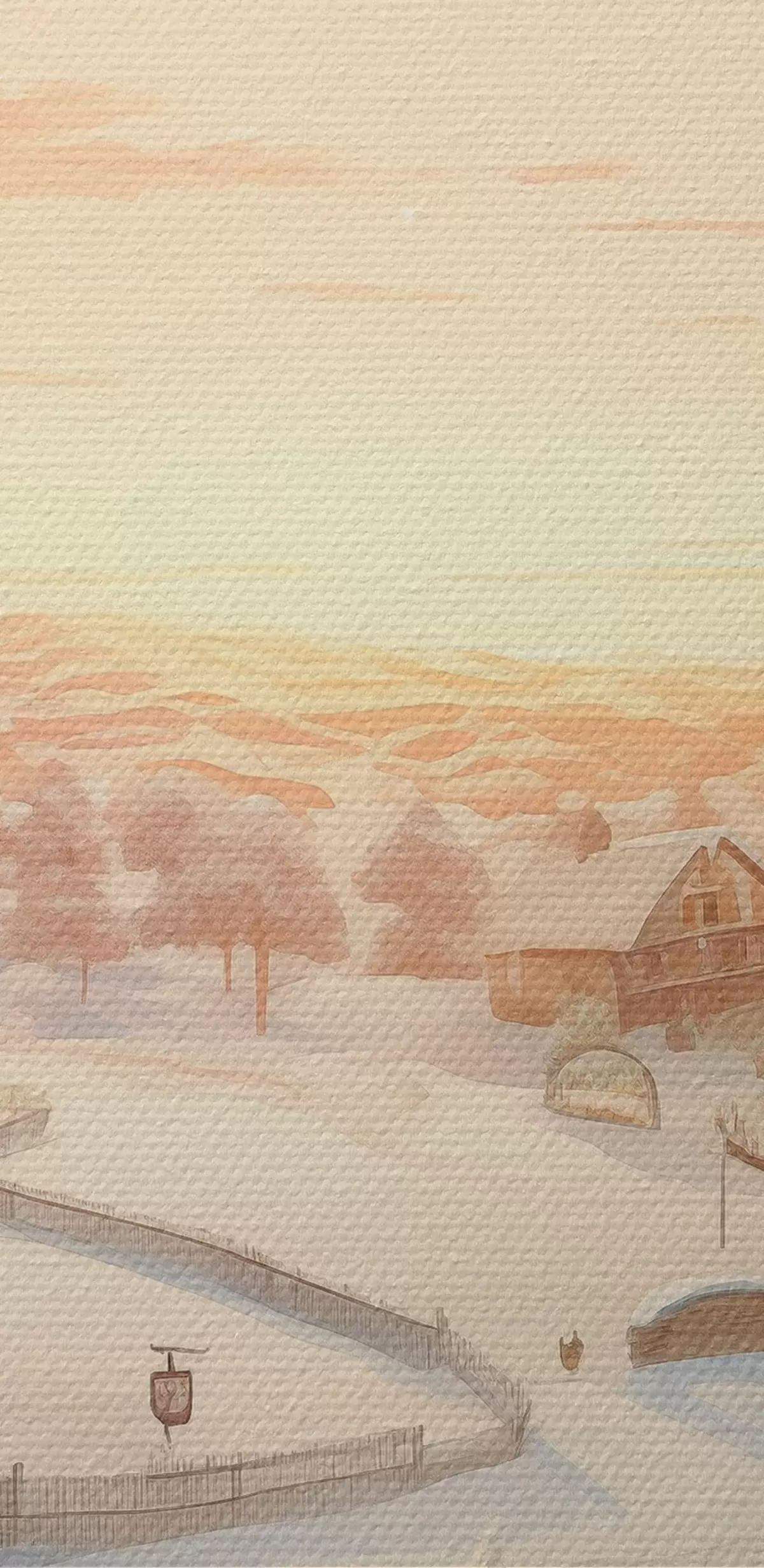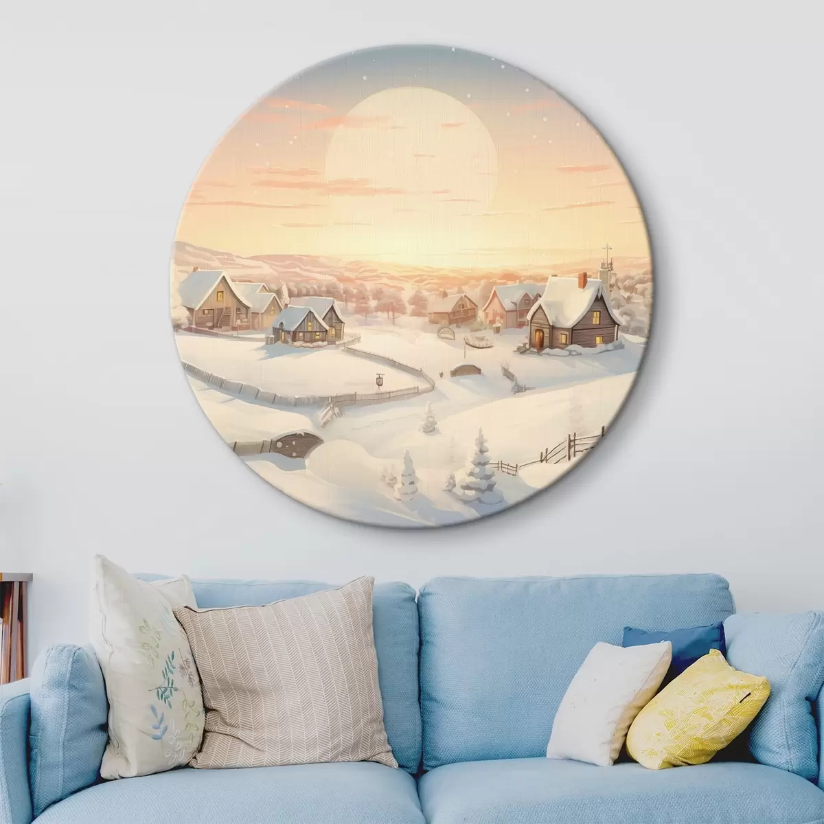 Ronde schilderijen Winterdorp bij zonsondergang, huizen bedekt met sneeuw, dennenbomen Nr r41380