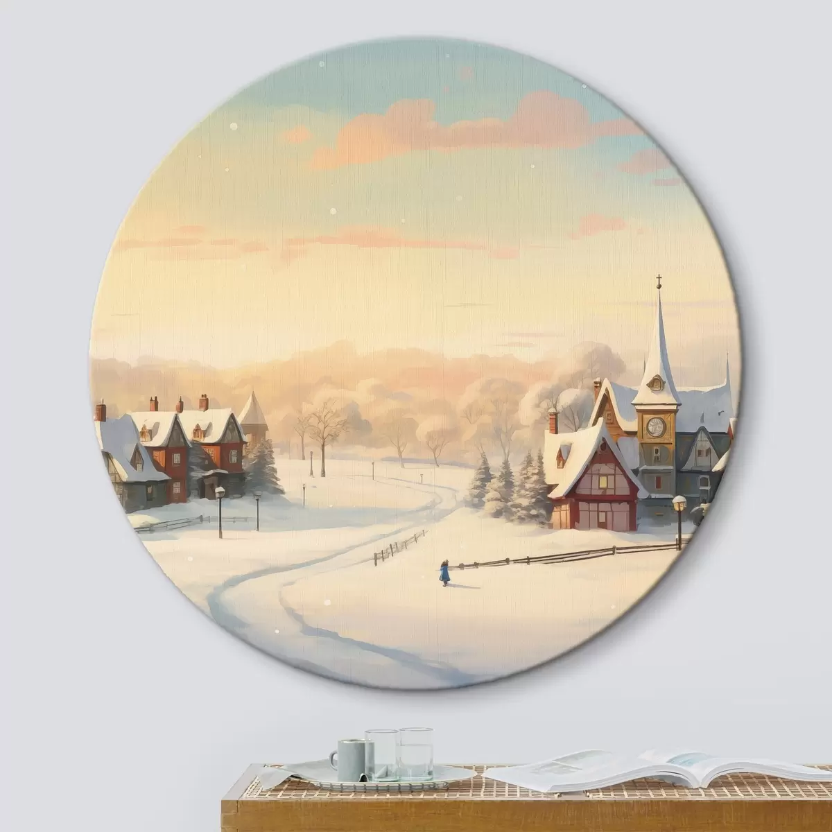 Ronde schilderijen Winterlandschap, huizen, zonsondergang, bomen, aquarel Nr r41383