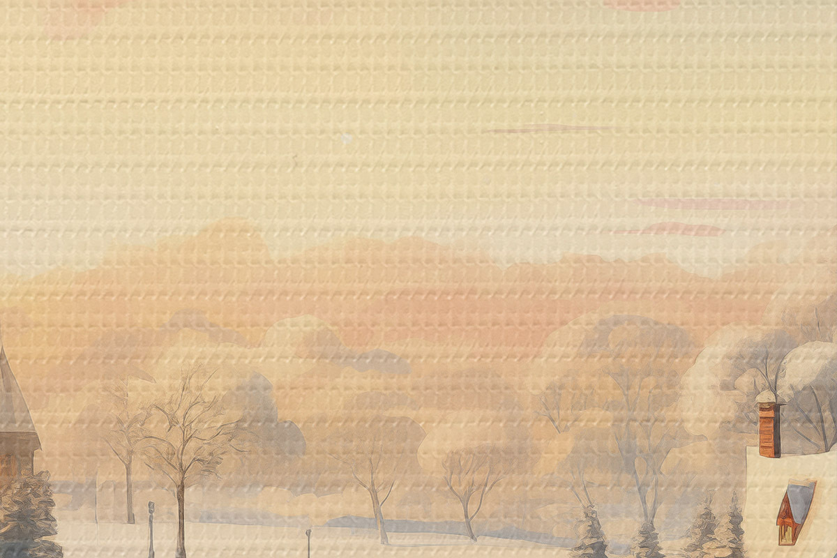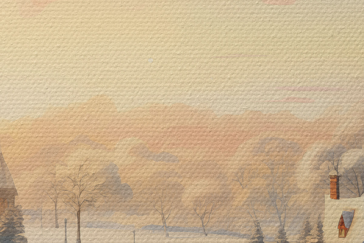Ronde schilderijen Winterlandschap, huizen, zonsondergang, bomen, aquarel r41383