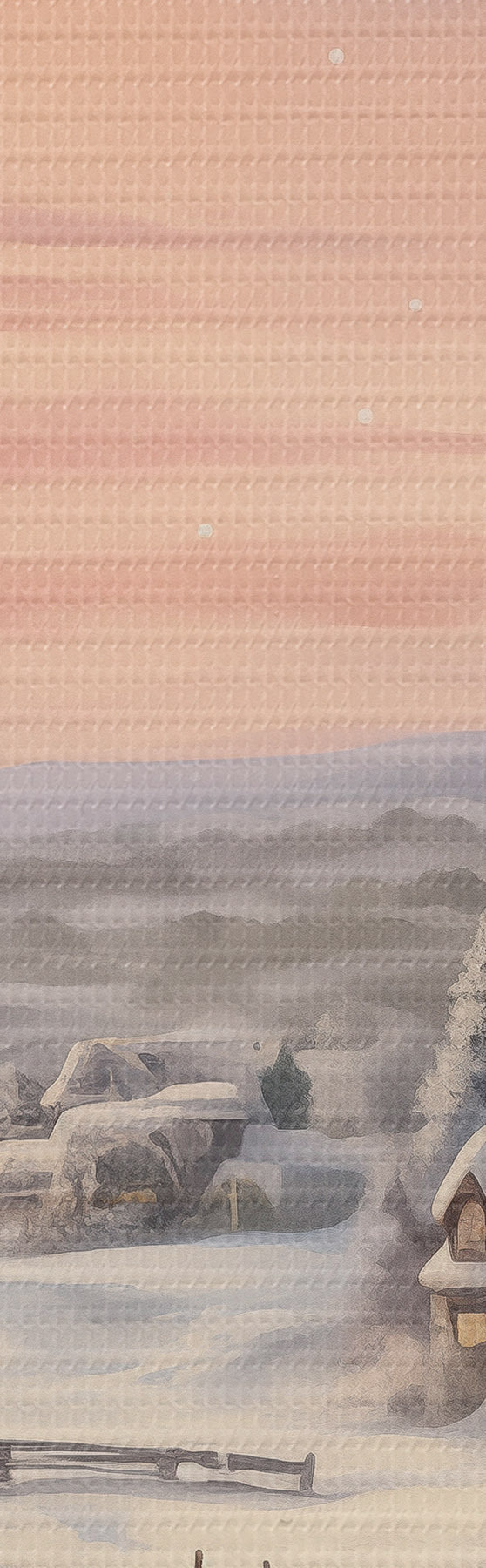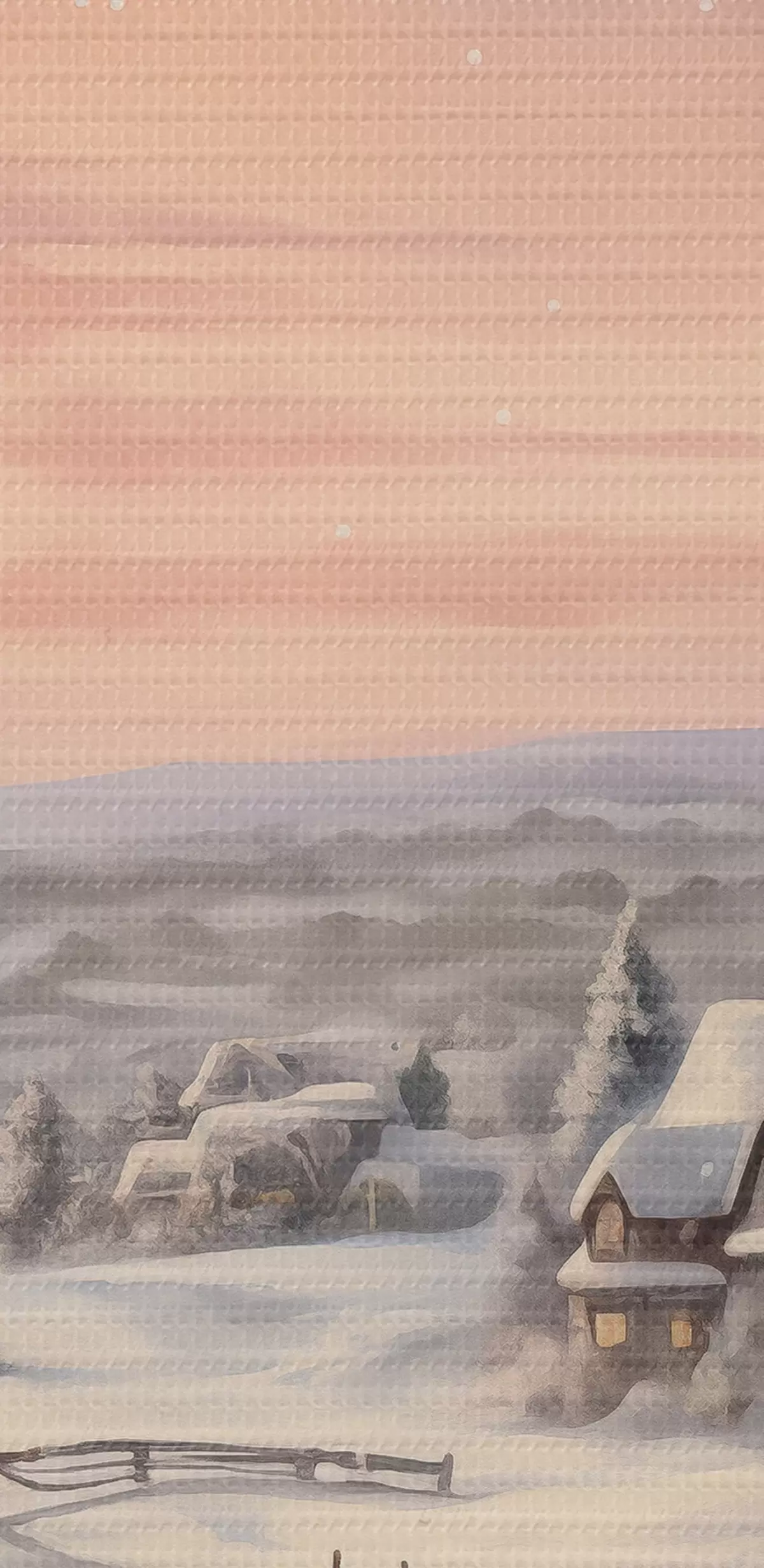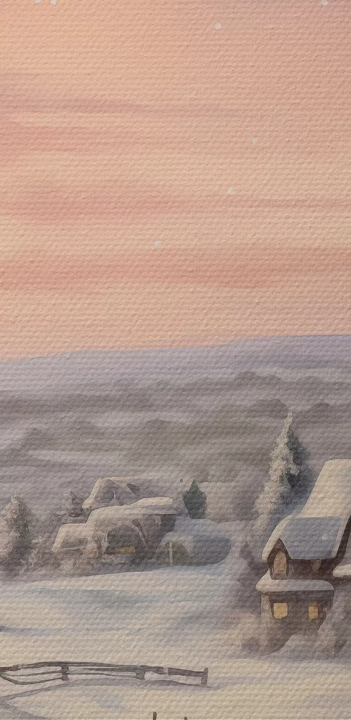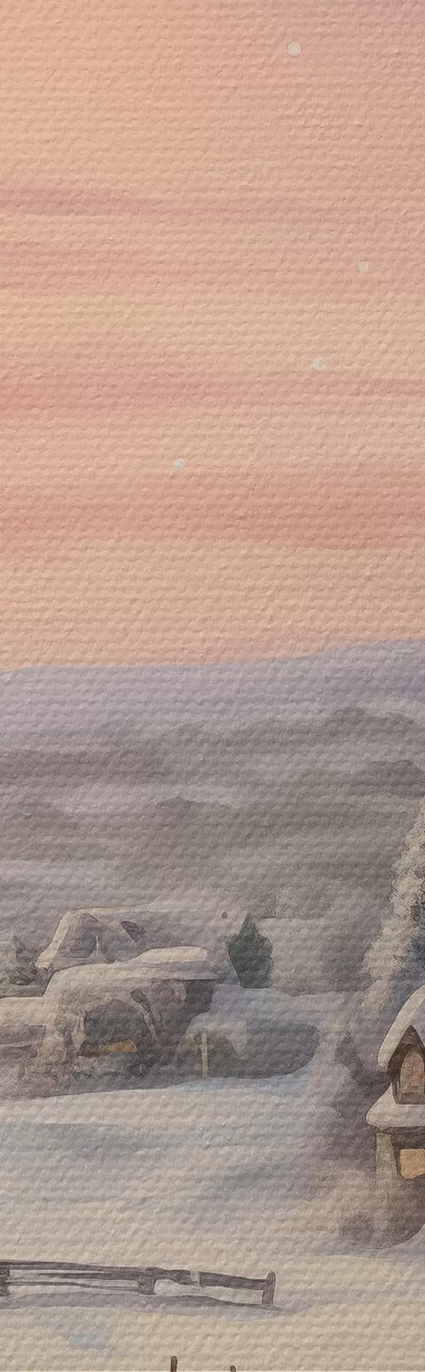 Ronde schilderijen Zonsondergang in het winterdorp, rustiek, aquarel, sneeuwvlokken Nr r41386