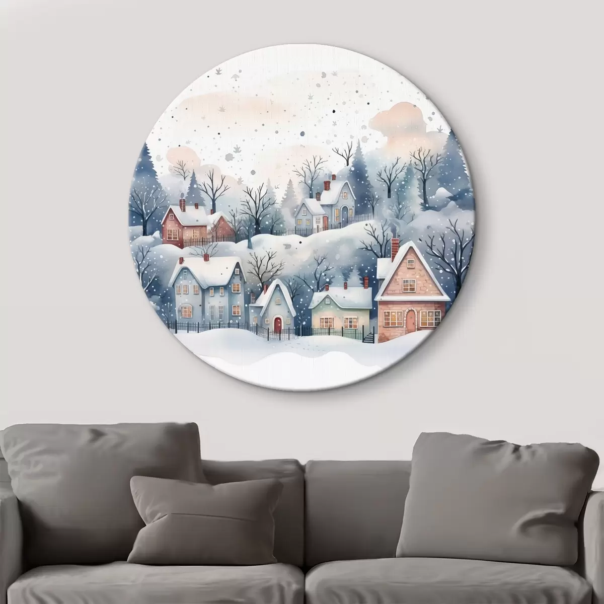 Ronde schilderijen Aquarel winterlandschap met huizen en dennenbos Nr r41389