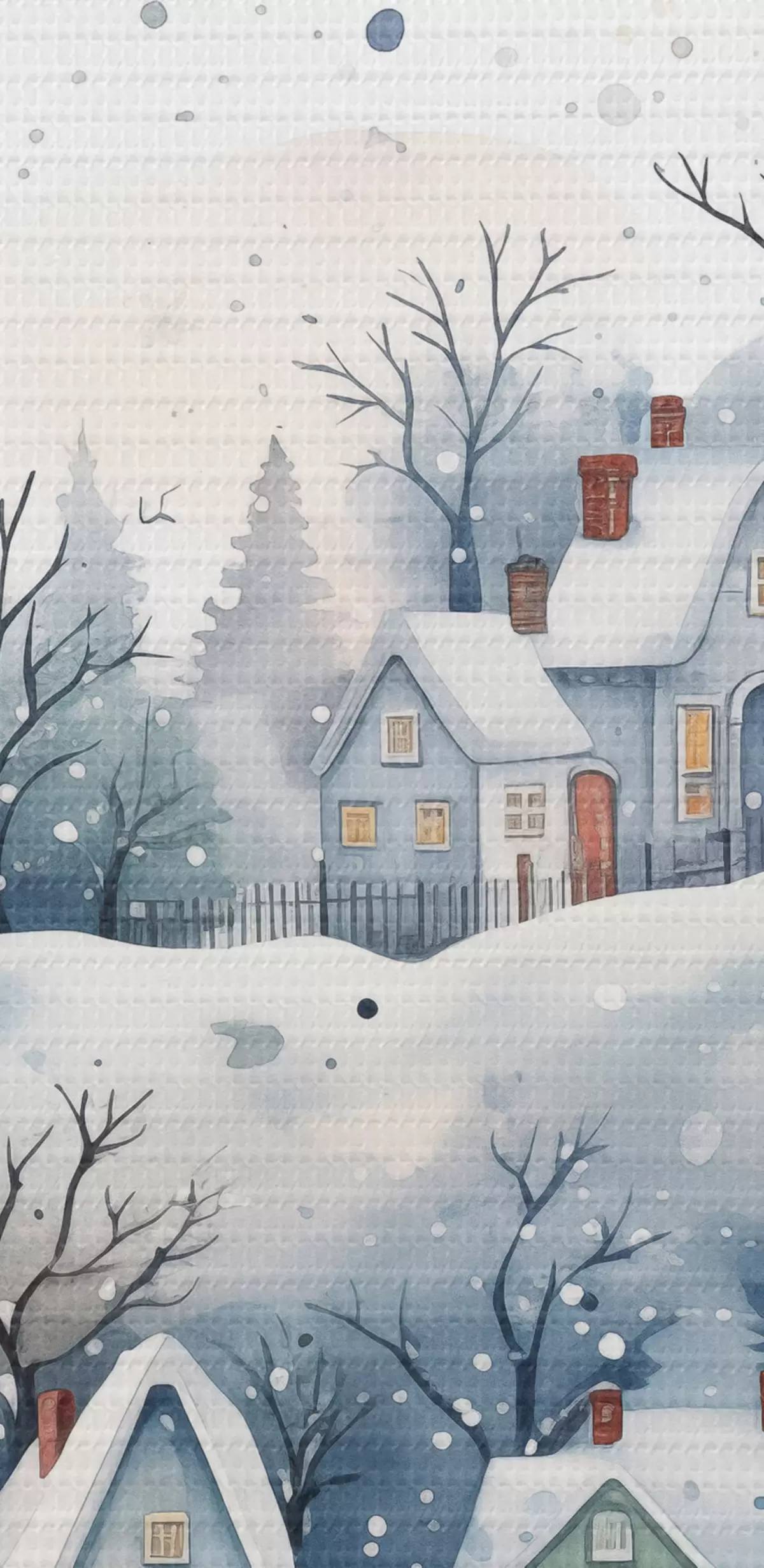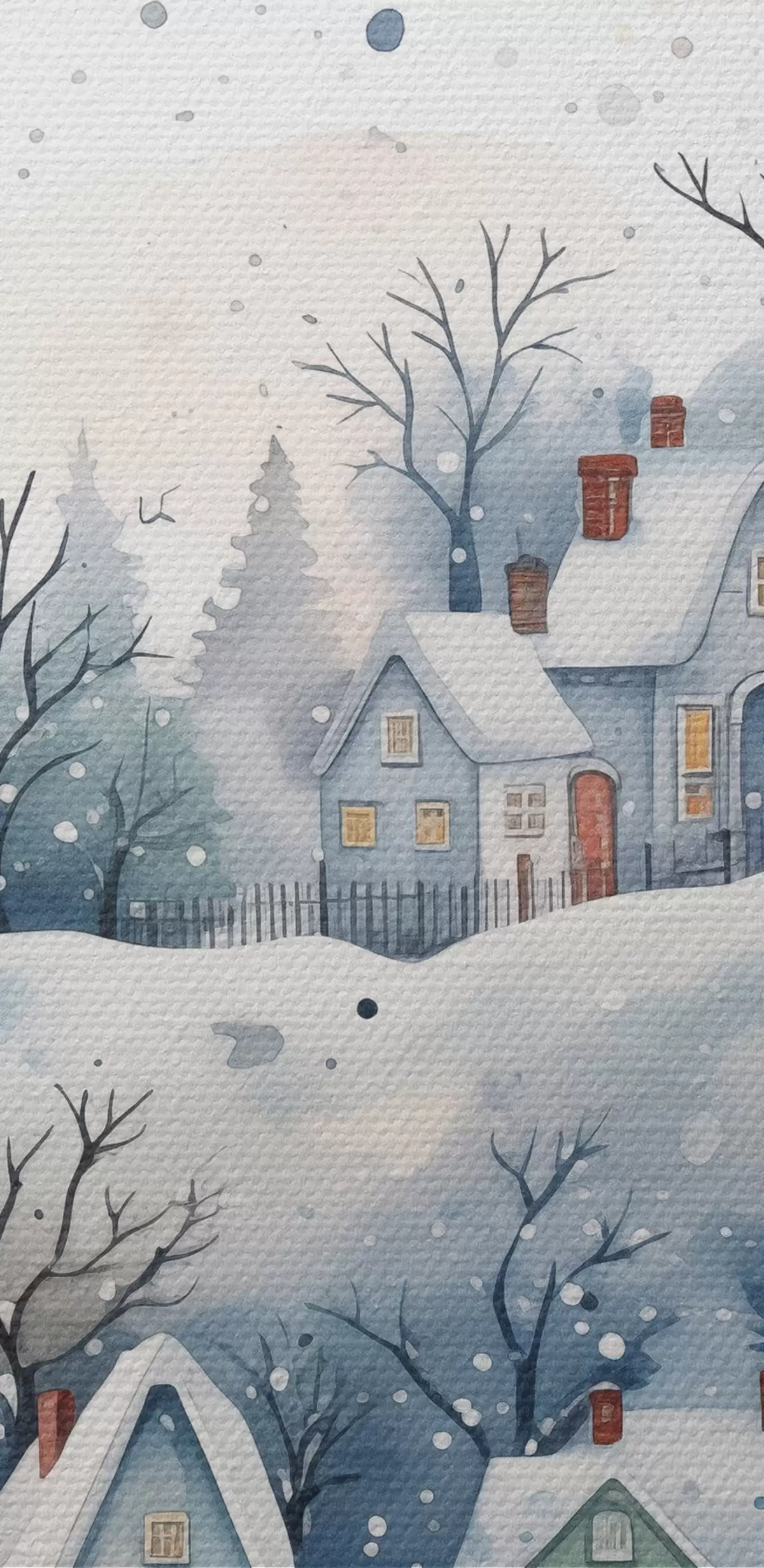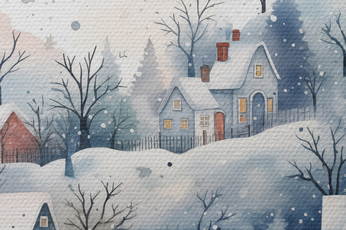 Ronde schilderijen Aquarel winterlandschap met huizen en dennenbos Nr r41389