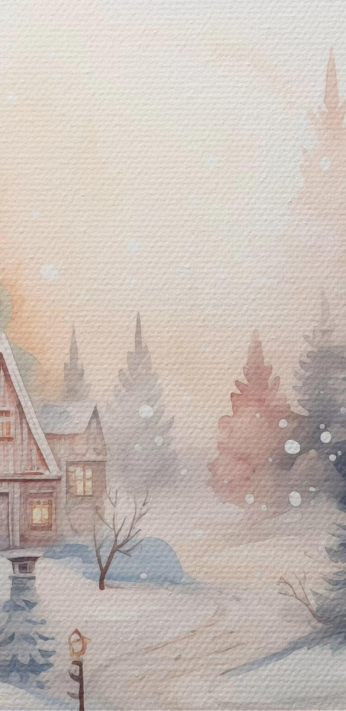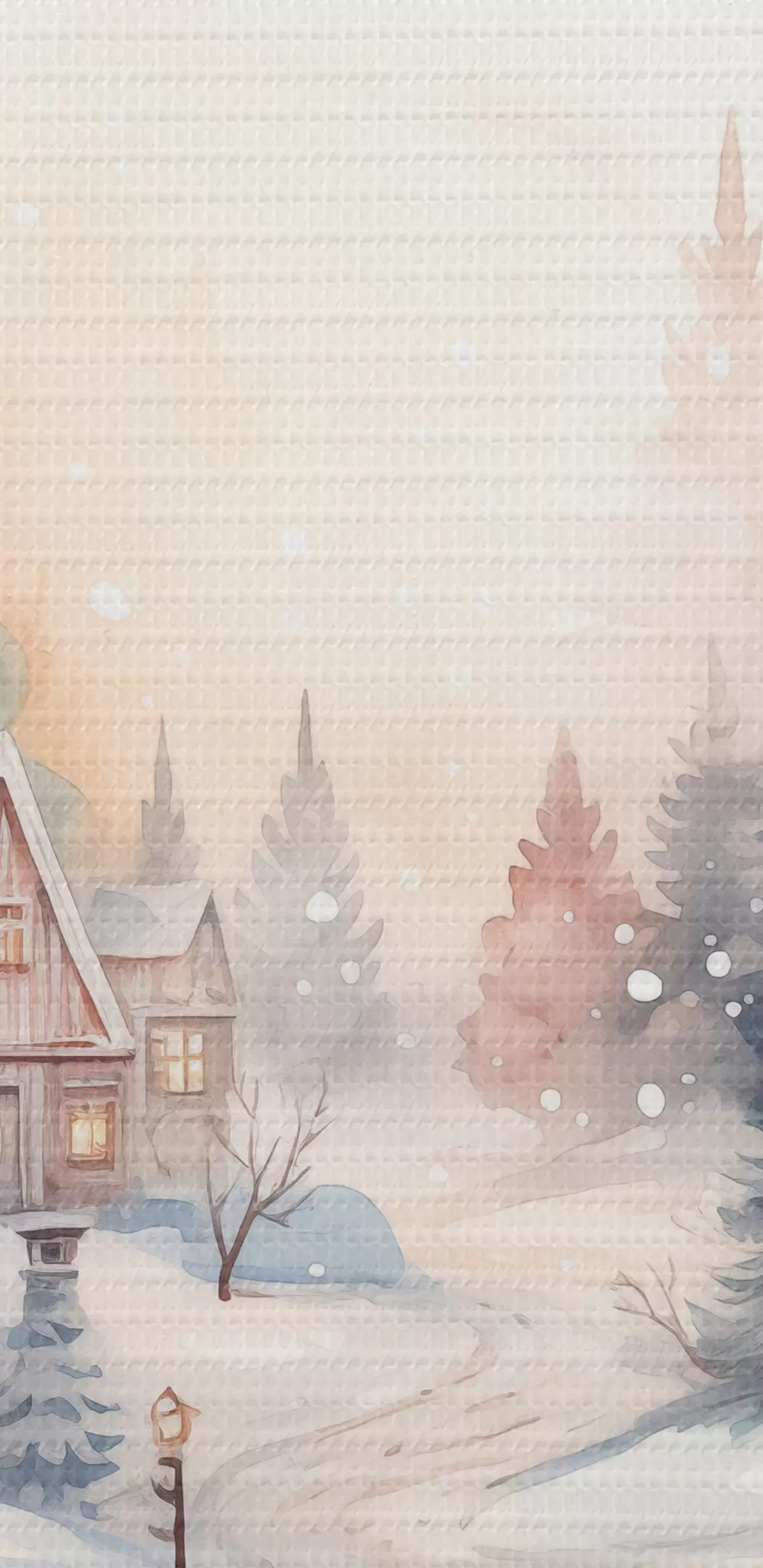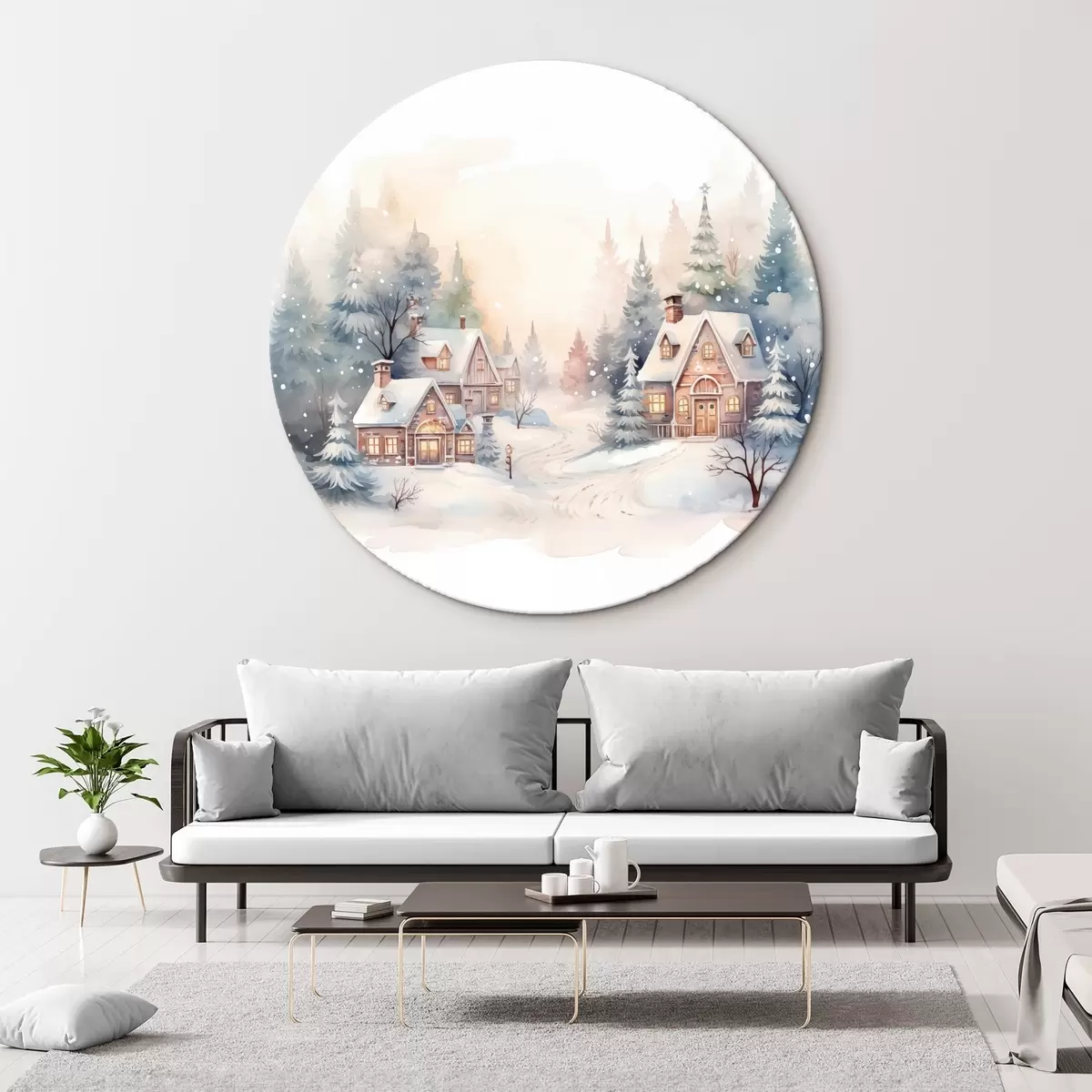 Ronde schilderijen Winterlandschap, dennenbos, mooie huizen, aquarel, susnet r41390