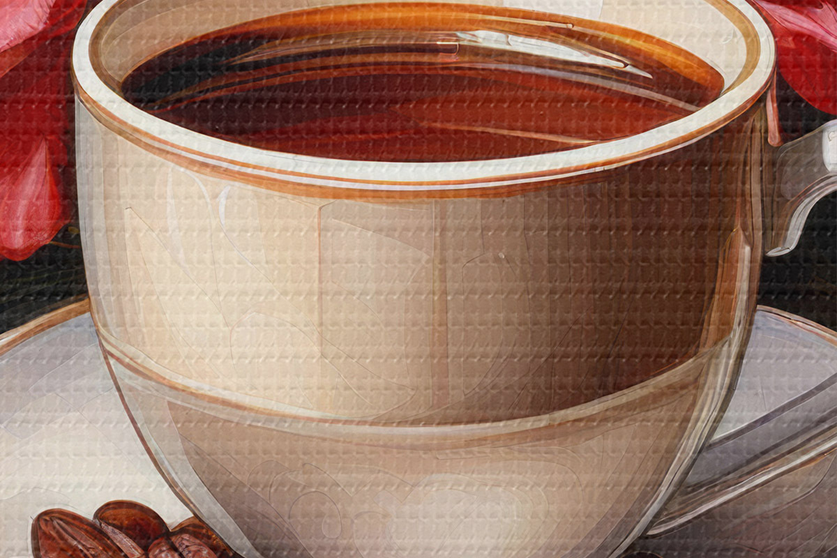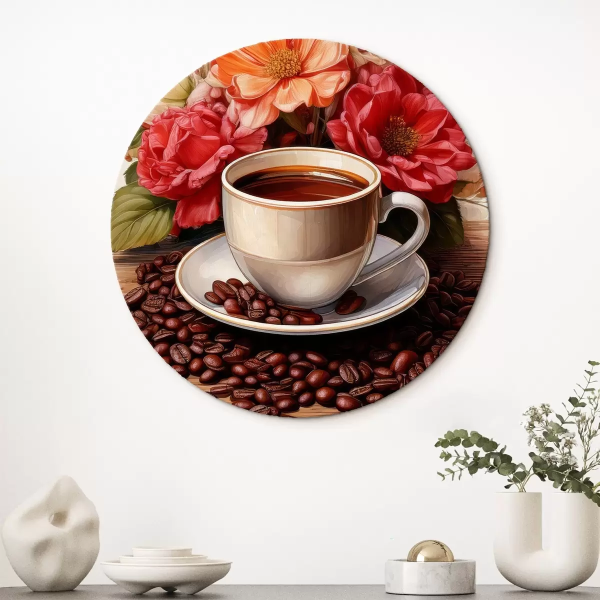 Ronde schilderijen een kop koffie en een boeket bloemen r41411
