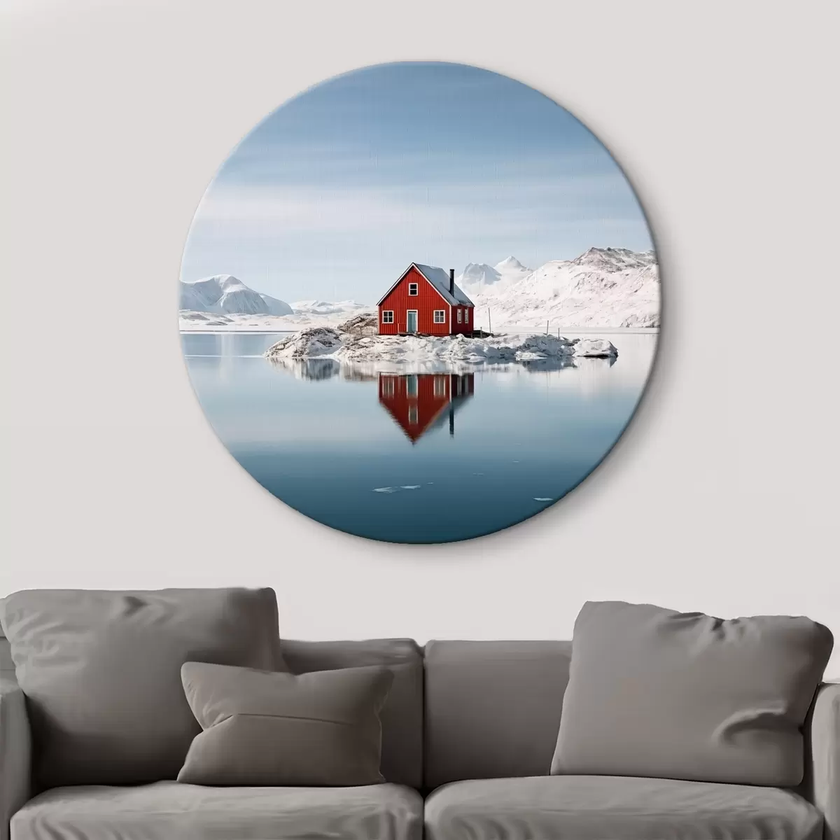 Ronde schilderijen Minimalistisch winterlandschap rood huis aan het meer Nr r41437