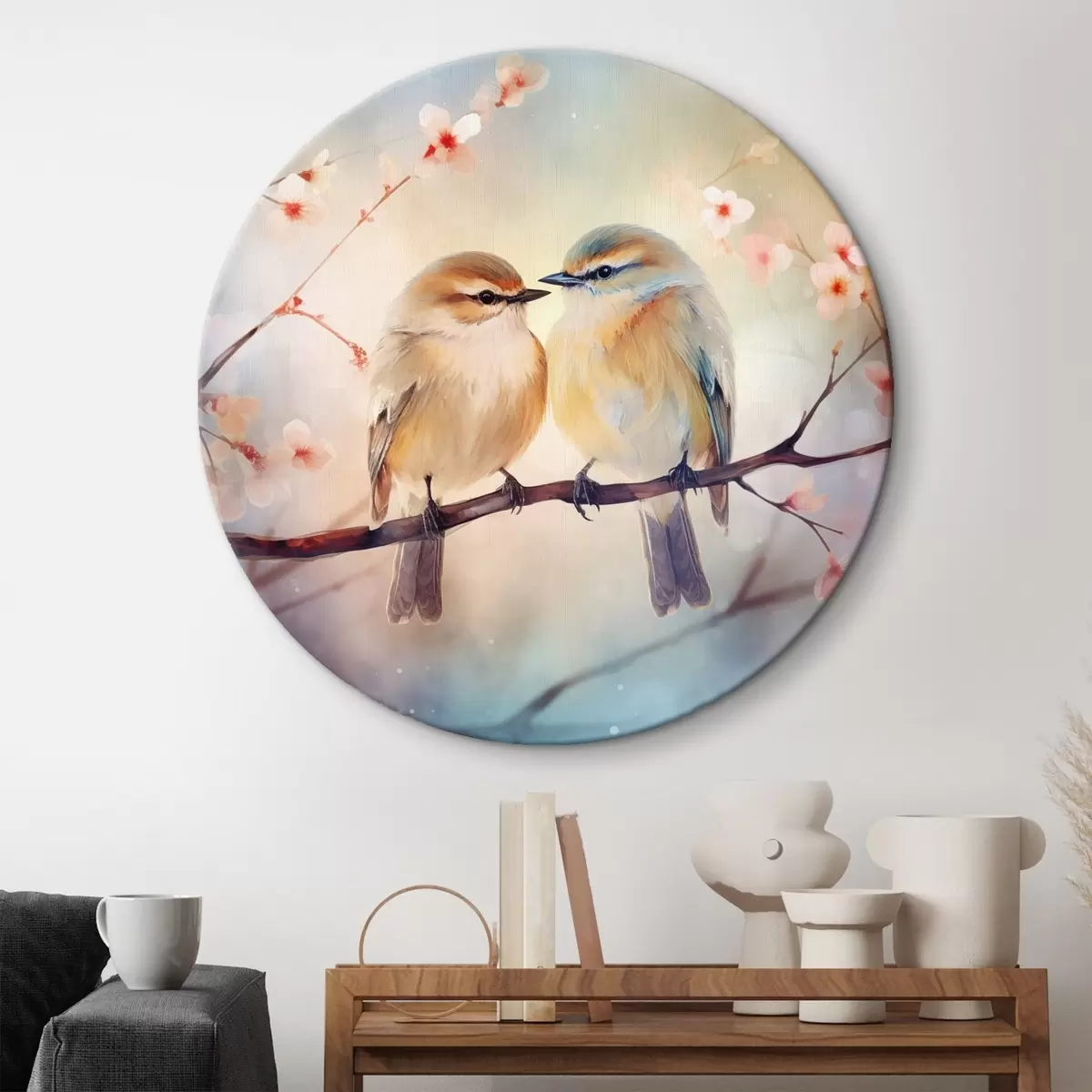 Ronde schilderijen Een vogelpaar zit op een bloeiende tak r41476