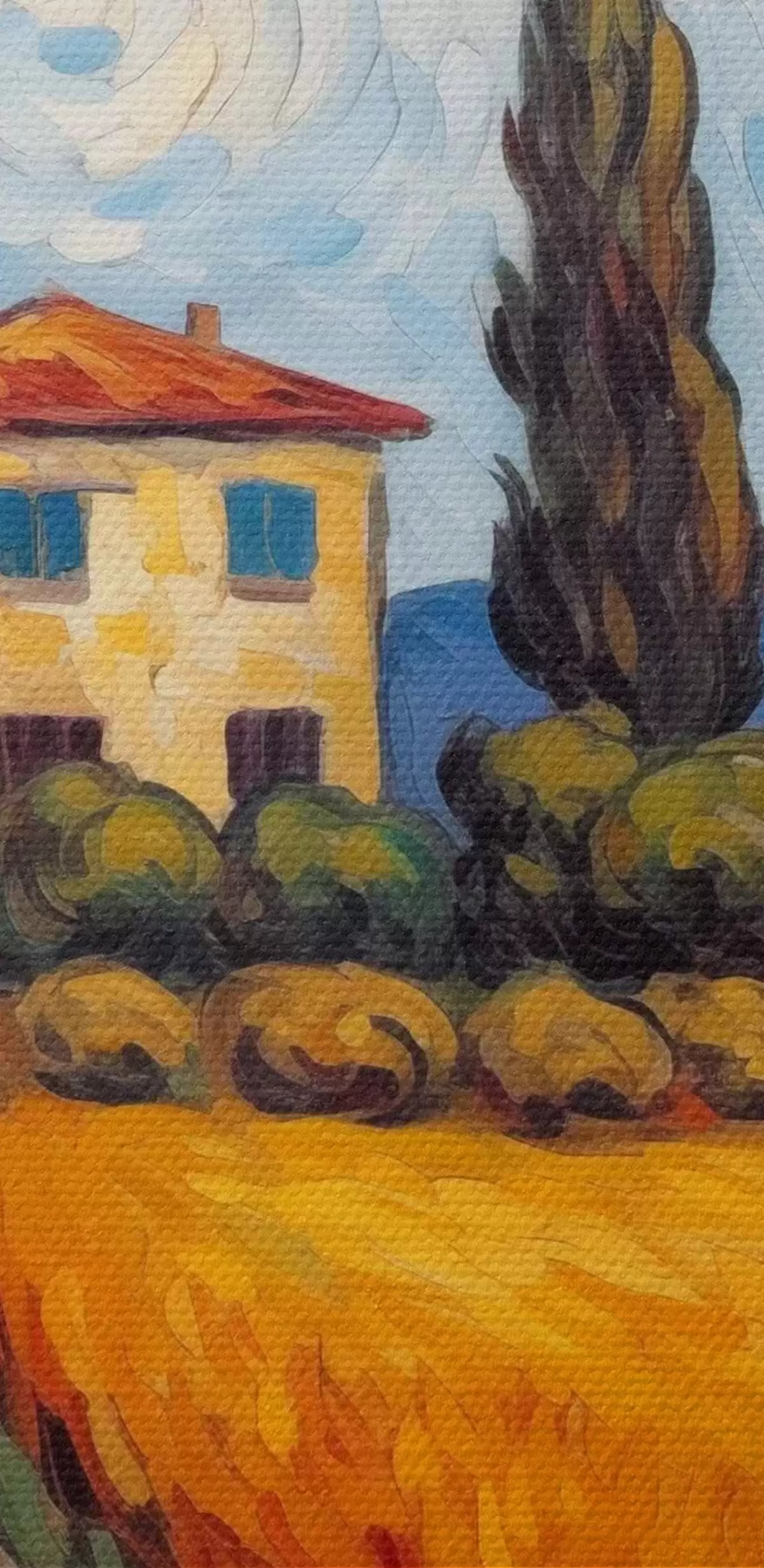 Het schilderij kan direct na ontvangst worden opgehangen. Het schilderij wordt opgespannen op een 2 cm breed houten spieraam.