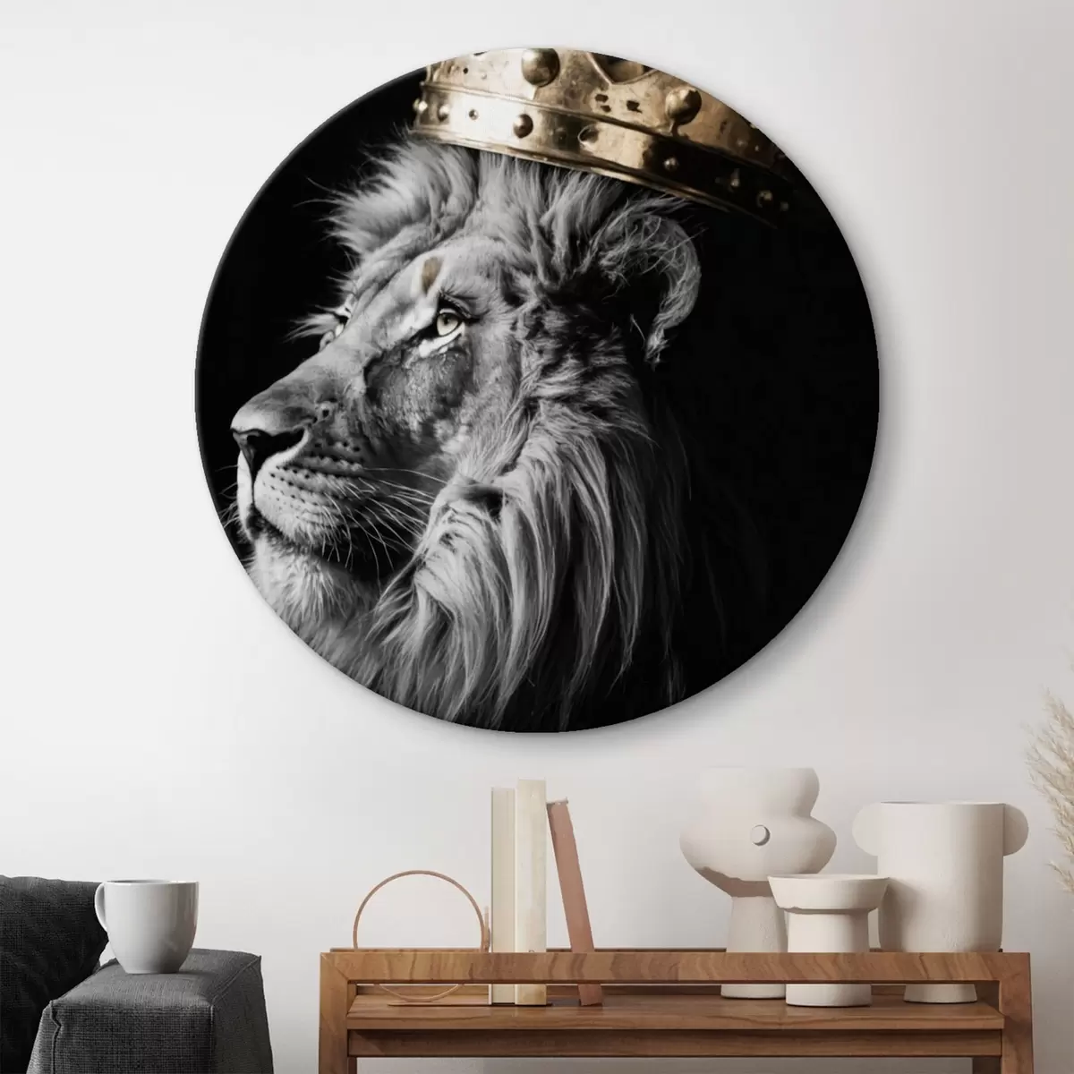 Ronde schilderijen Leeuw met kroon op donkere achtergrond r42096