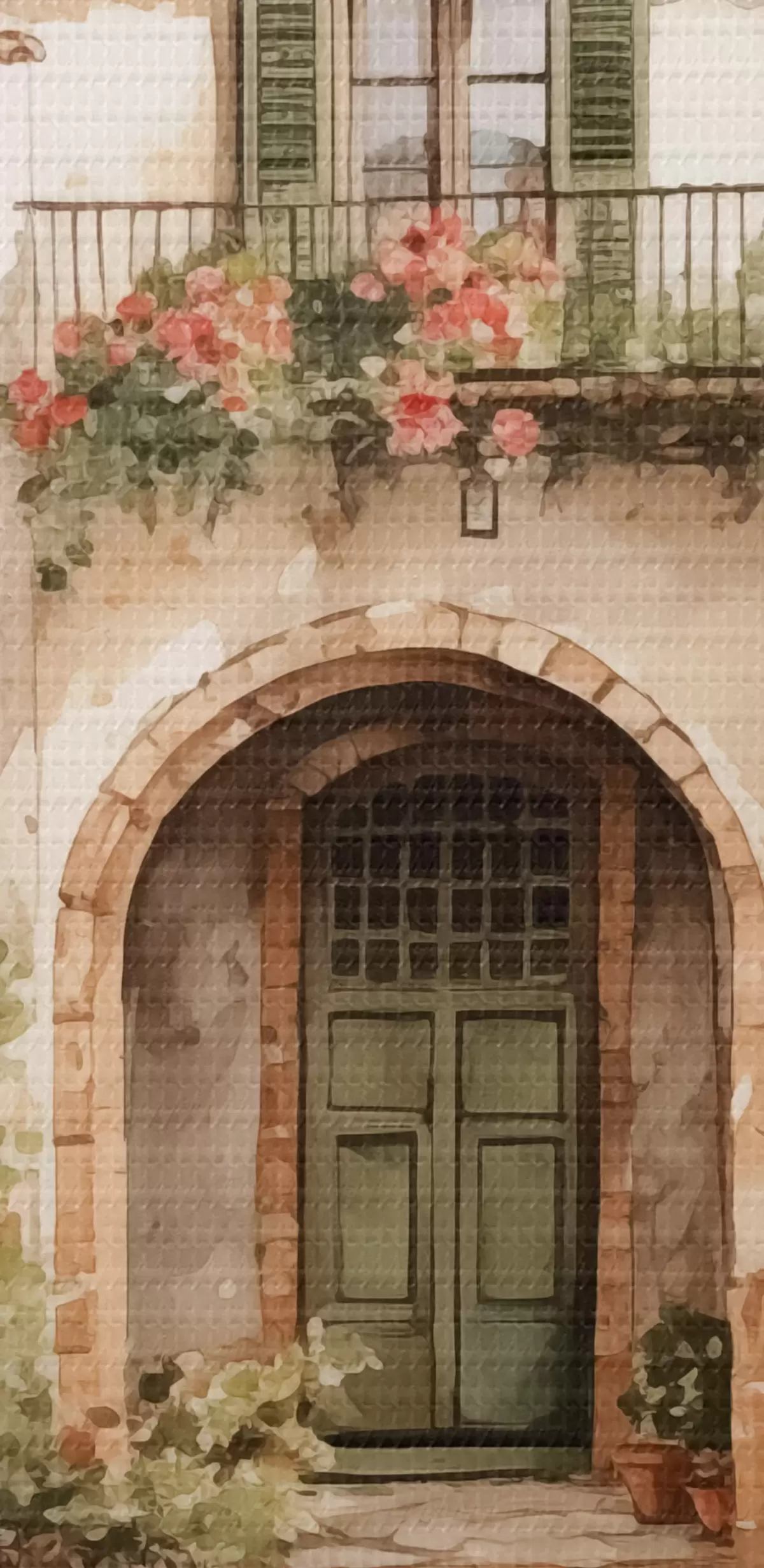 Ronde schilderijen Italiaanse binnenplaats met bloempotten imitatie van aquarel Nr r42126