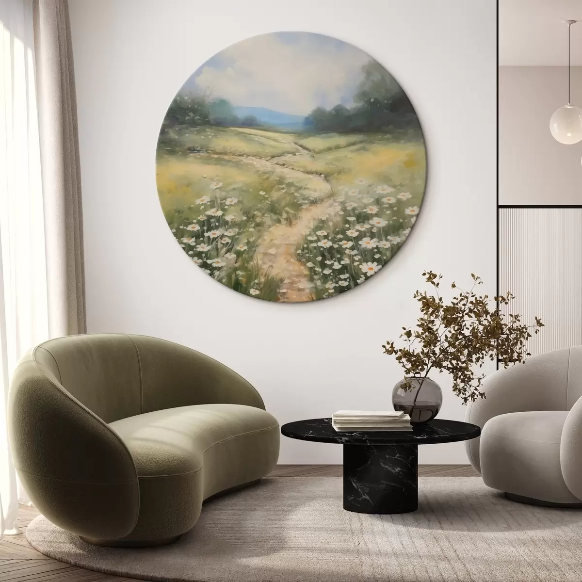 Ronde schilderijen Weide met madeliefjes imitatie van schilderij Nr r42134
