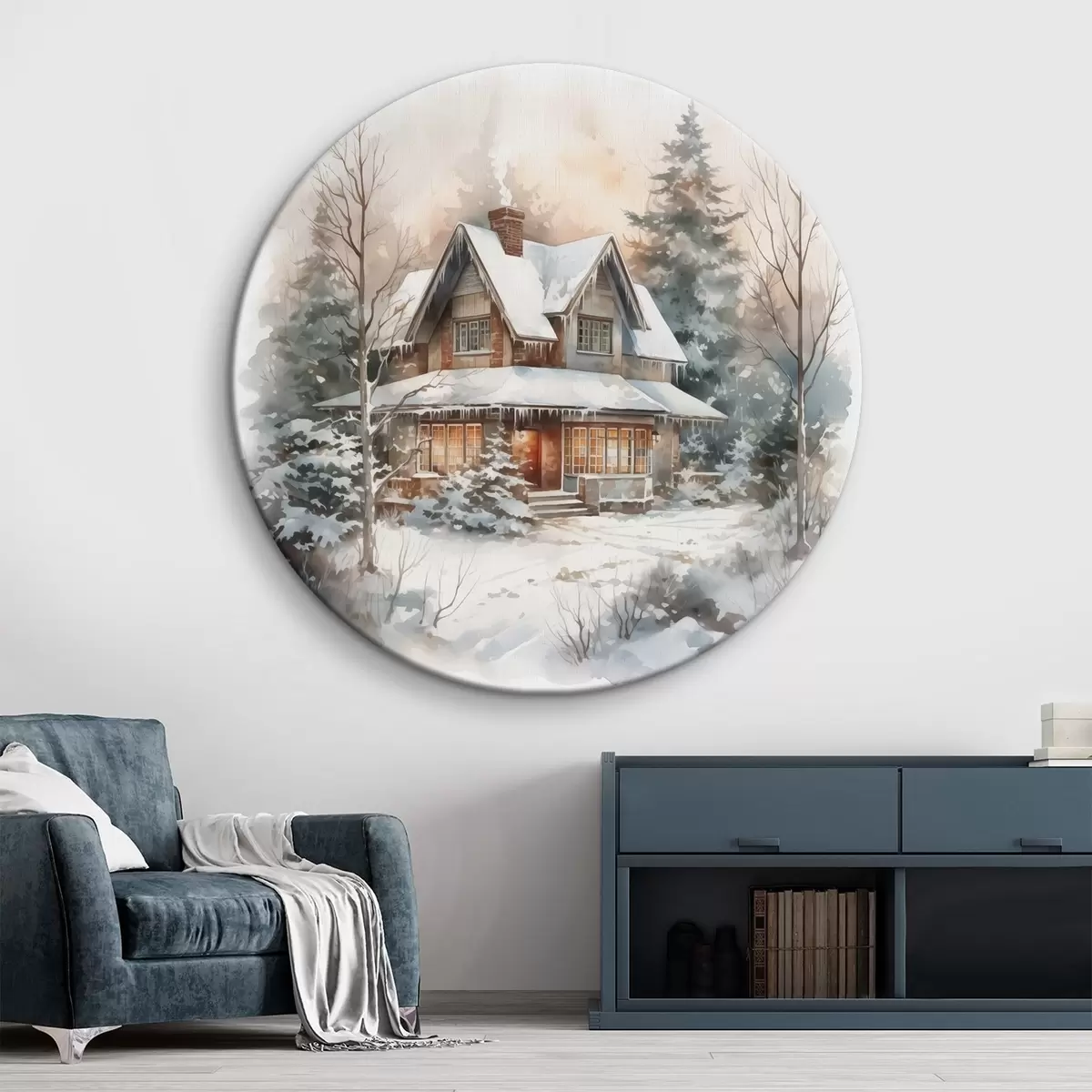 Ronde schilderijen Huis in een besneeuwd bos imitatie van aquarel Nr r42137