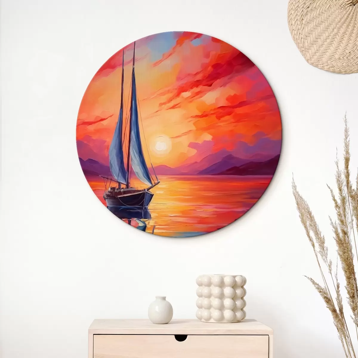 Ronde schilderijen Zeilboot op de achtergrond van een heldere zonsondergang Nr r42151