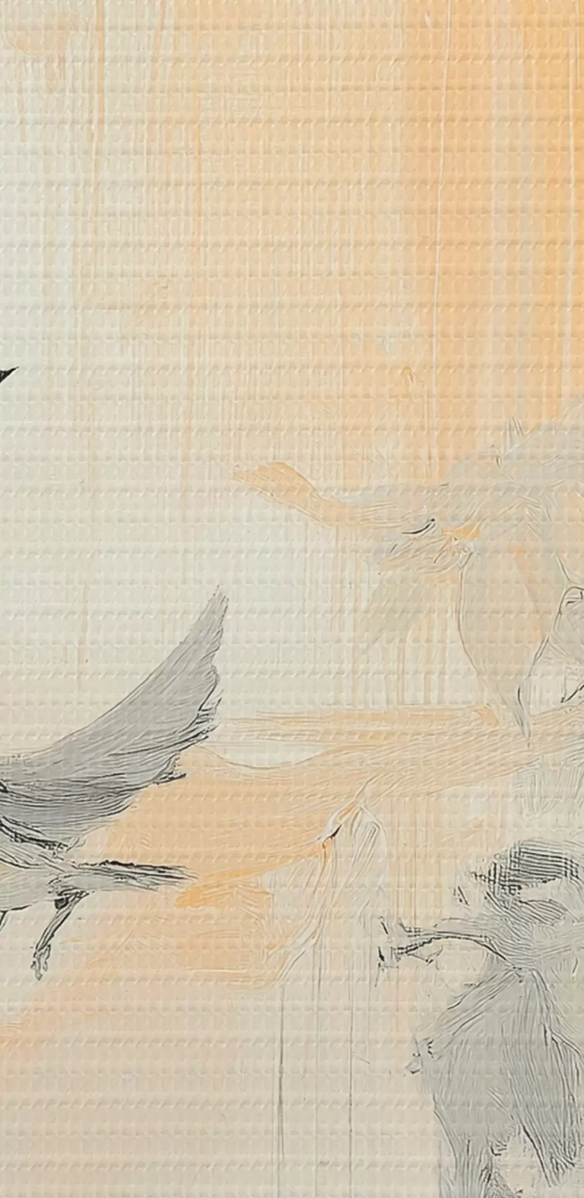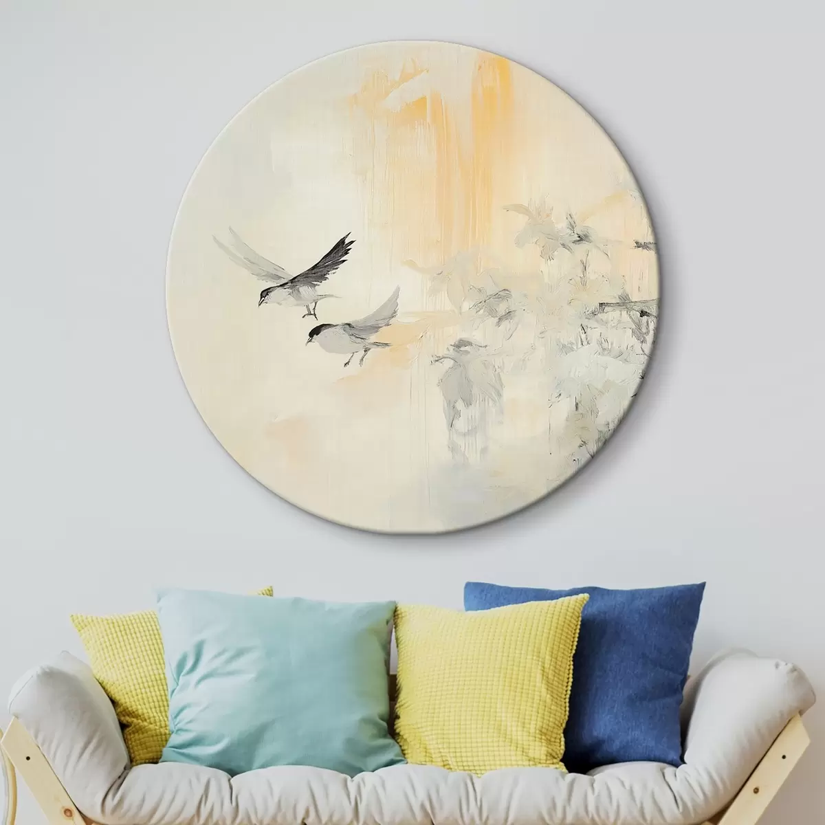 Ronde schilderijen Abstractie met vogels, acrylstijl, grijze en beige kleuren Nr r42206