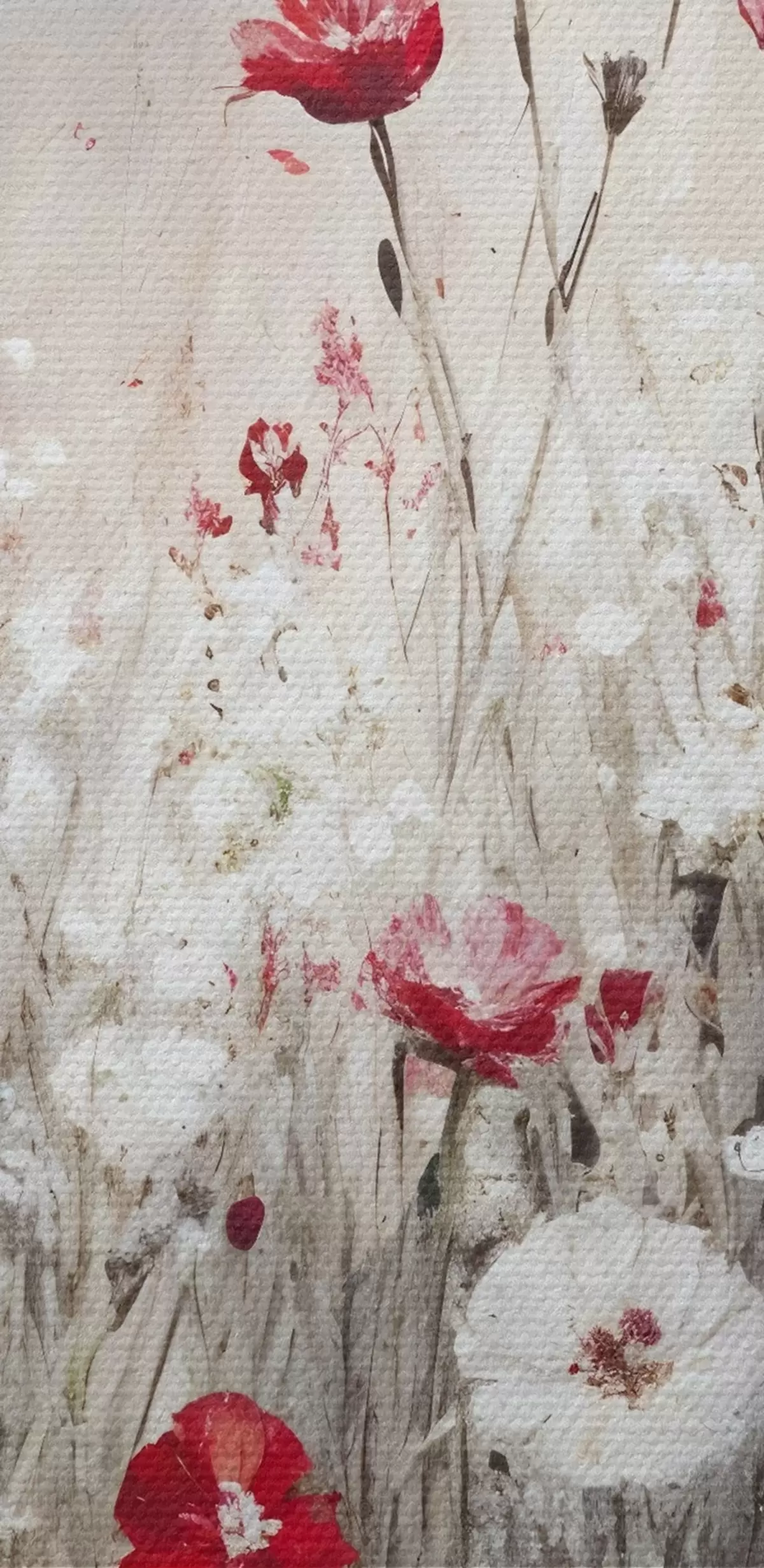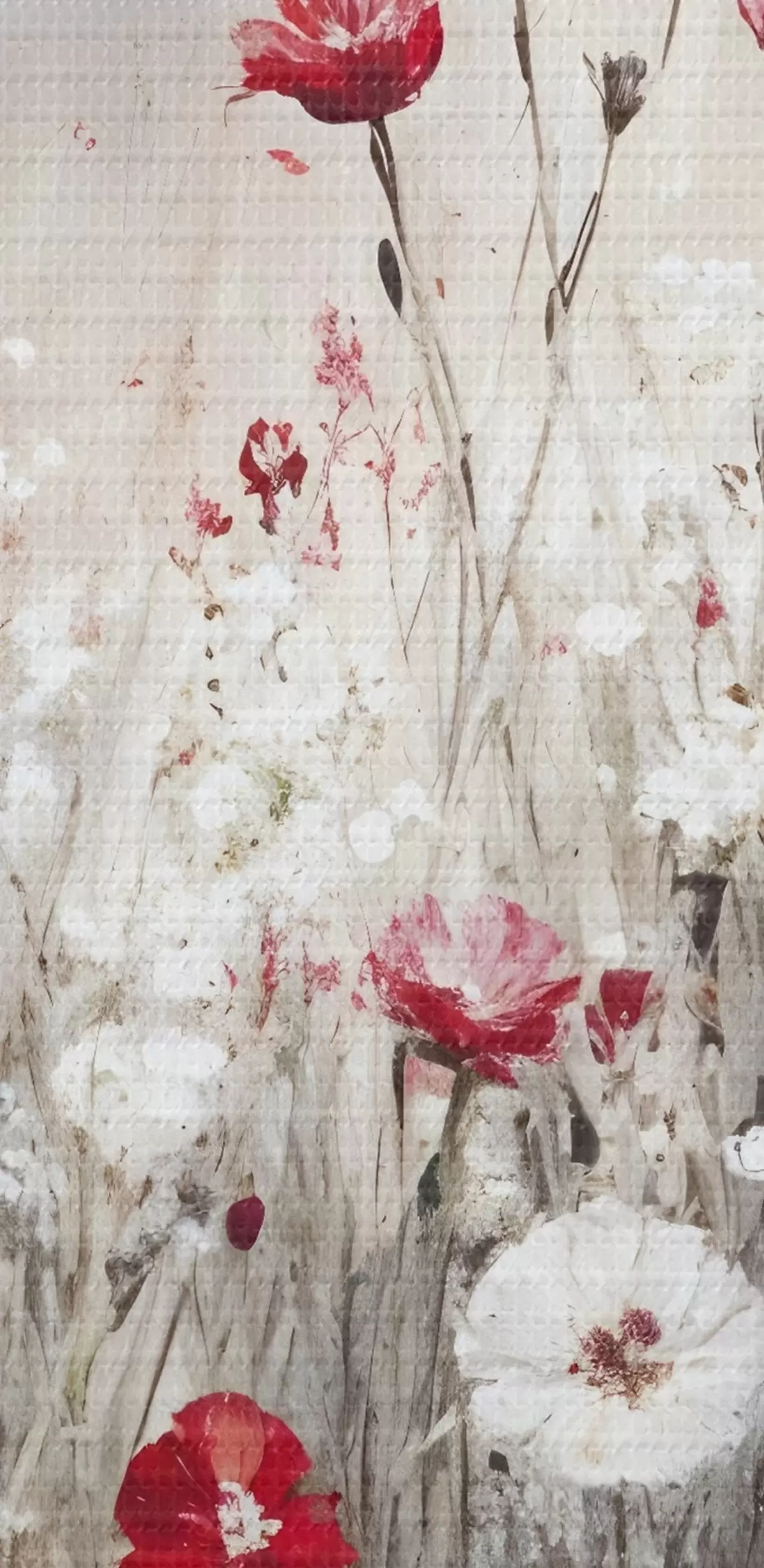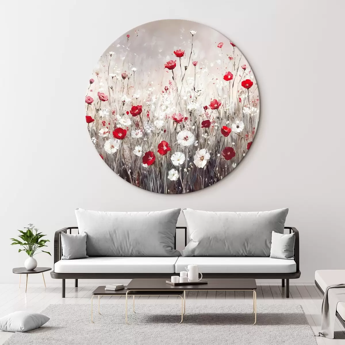 Ronde schilderijen Abstracte imitatie van olieverfschilderij een veld van rode en witte klaprozen en madeliefjes bloemen tegen een grijze texturale achtergrond Nr r42213