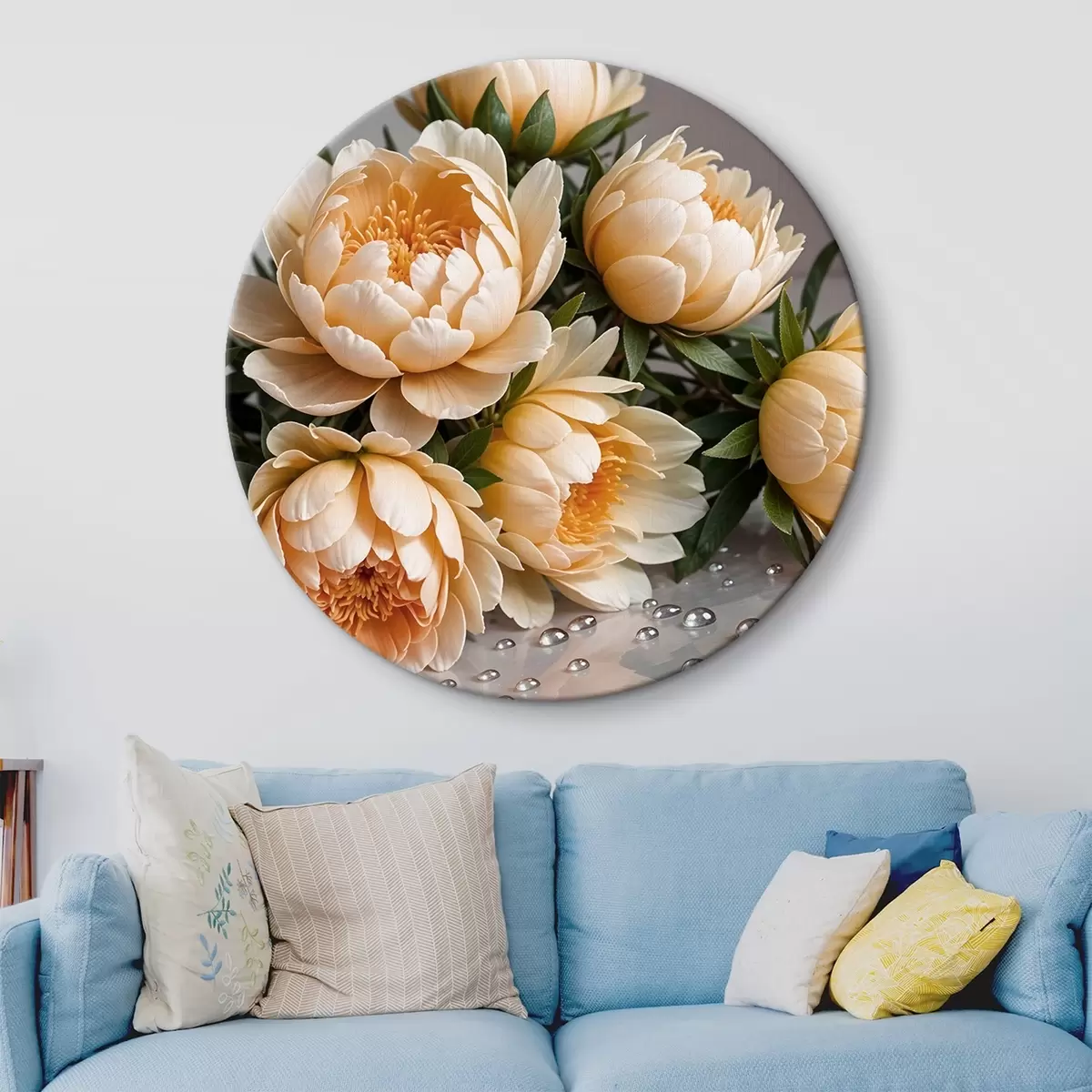 Ronde schilderijen Crèmekleurige gedetailleerde pioenbloemen met donkergroene bladeren op een grijze achtergrond Nr r42215