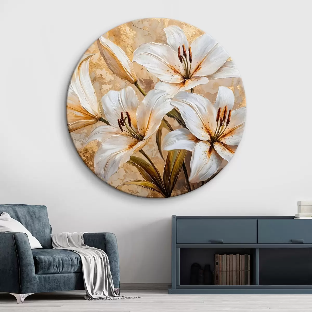 Ronde schilderijen Witte lelies met gele harten tegen een beige achtergrond met textuur Nr r42216
