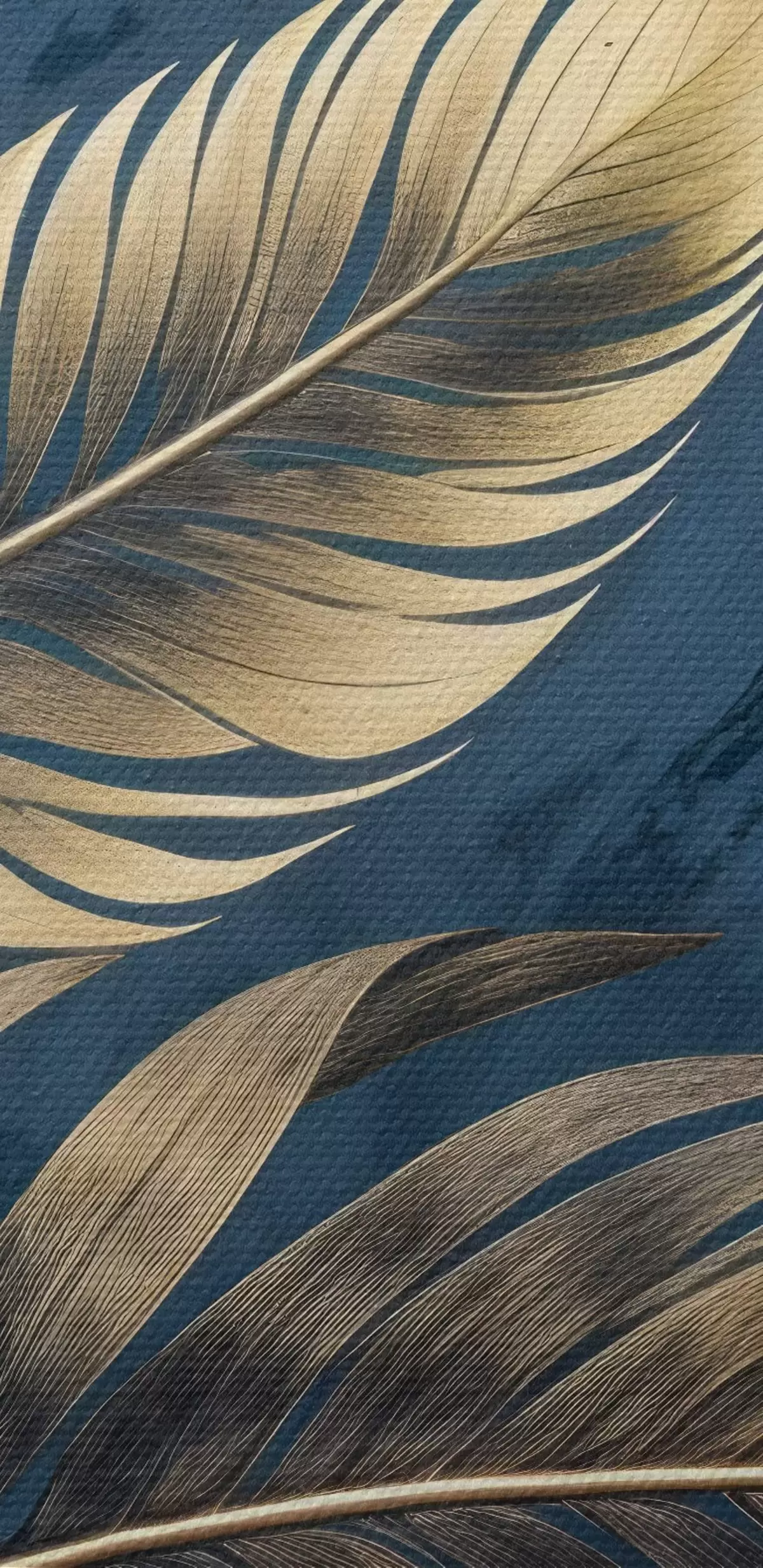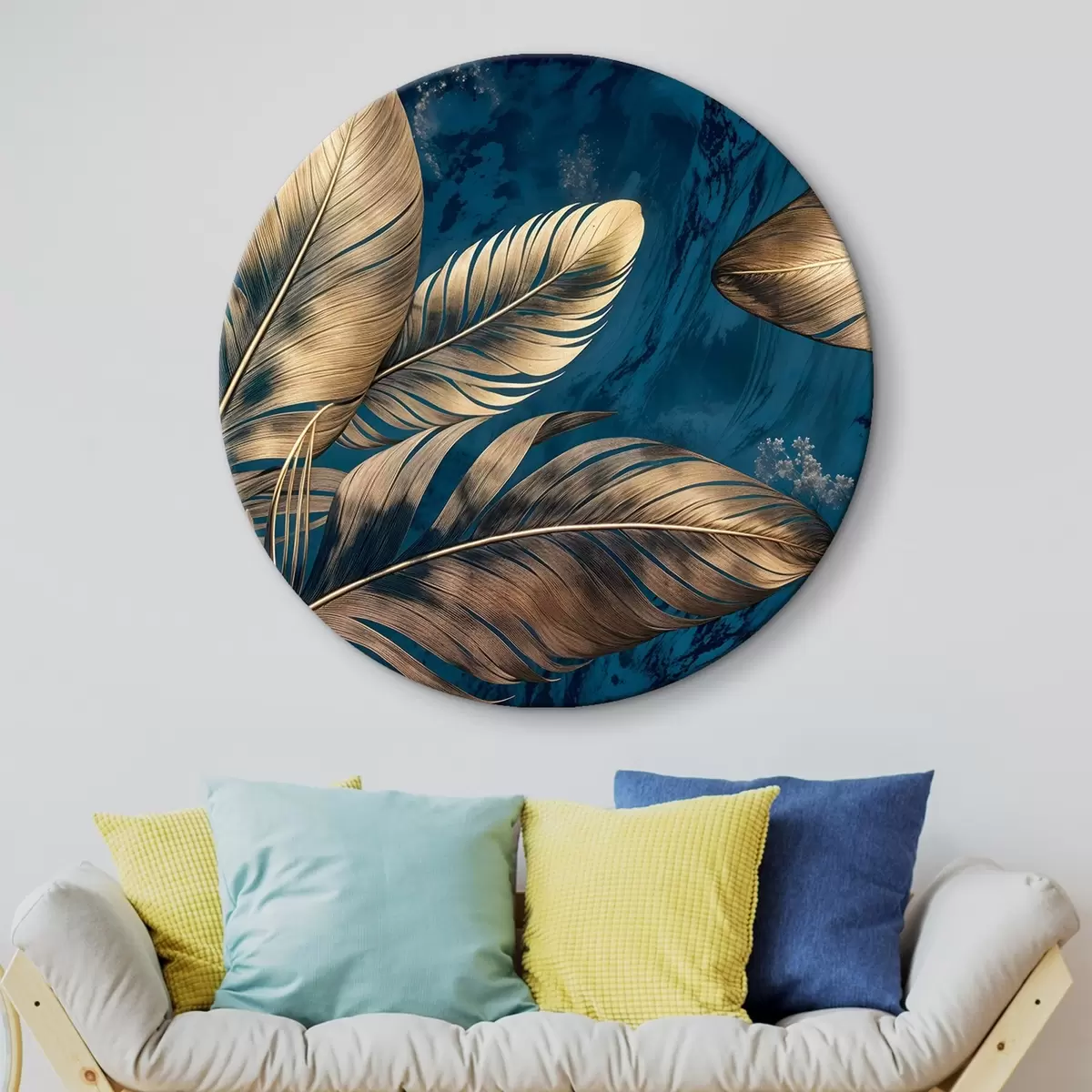 Ronde schilderijen Gele en beige abstracte decoratieve veren drijvend op een donkerblauwe textuurachtergrond Nr r42218