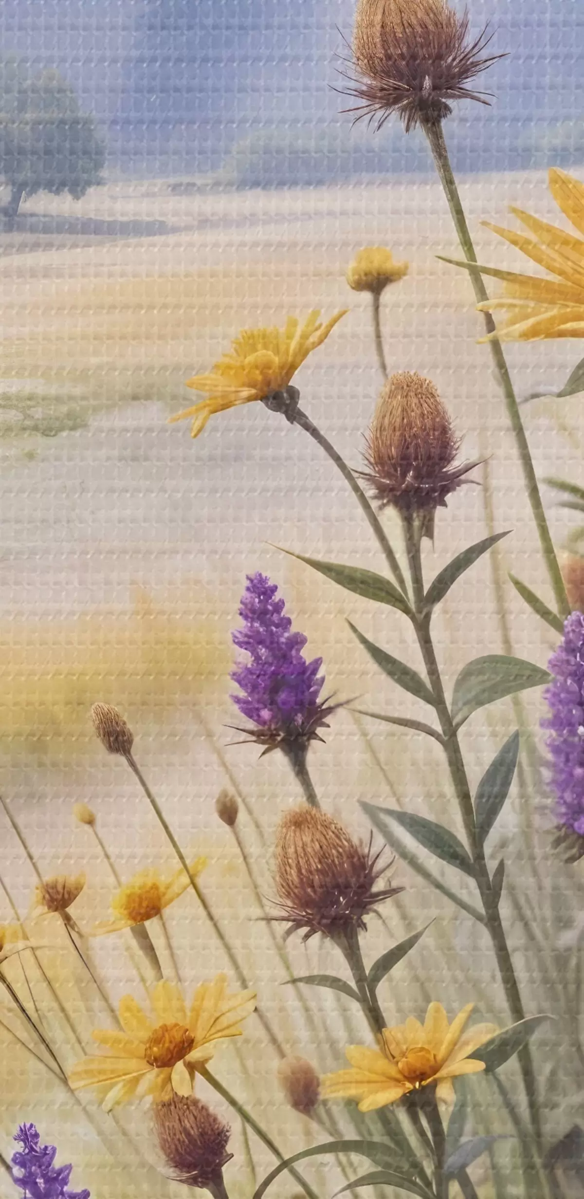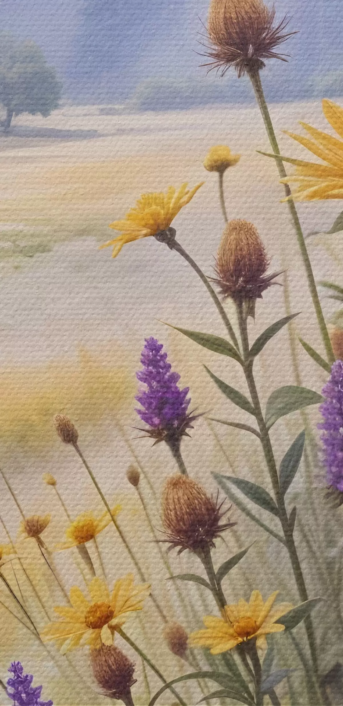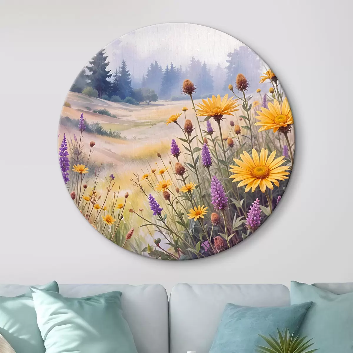 Ronde schilderijen Een veld met gele zonnebloemen en paarse wilde bloemen in een mistig boslandschap met pijnbomen op de achtergrond Nr r42223