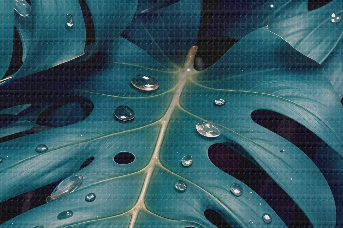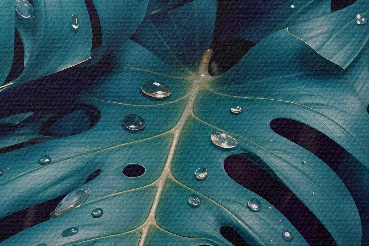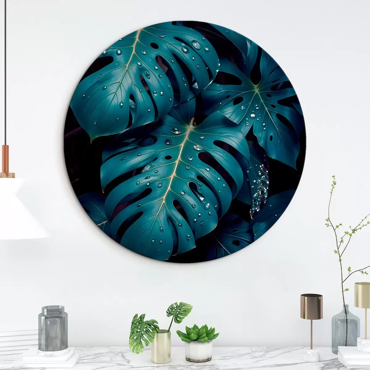 Ronde schilderijen Weelderige tropische monsterabladeren met waterdruppels tegen een donkere achtergrond, waardoor een stemmige en sfeervolle print ontstaat Nr r42233