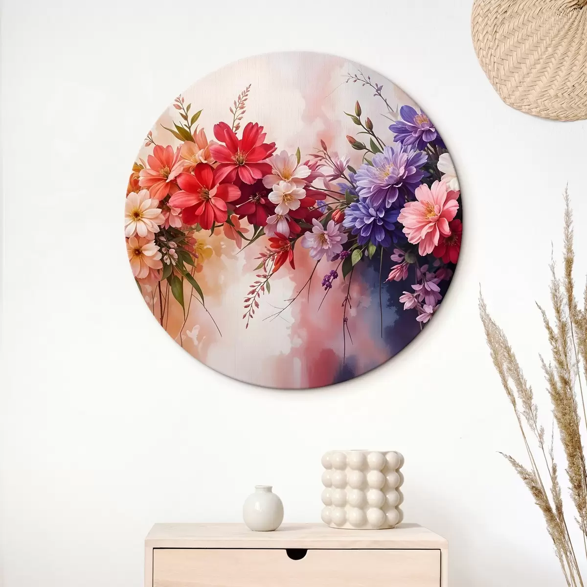 Ronde schilderijen Kleurrijke bloemen zoals rode, roze en paarse dahlia's, margrieten en andere bloemen tegen een zachte, onscherpe achtergrond Nr r42234
