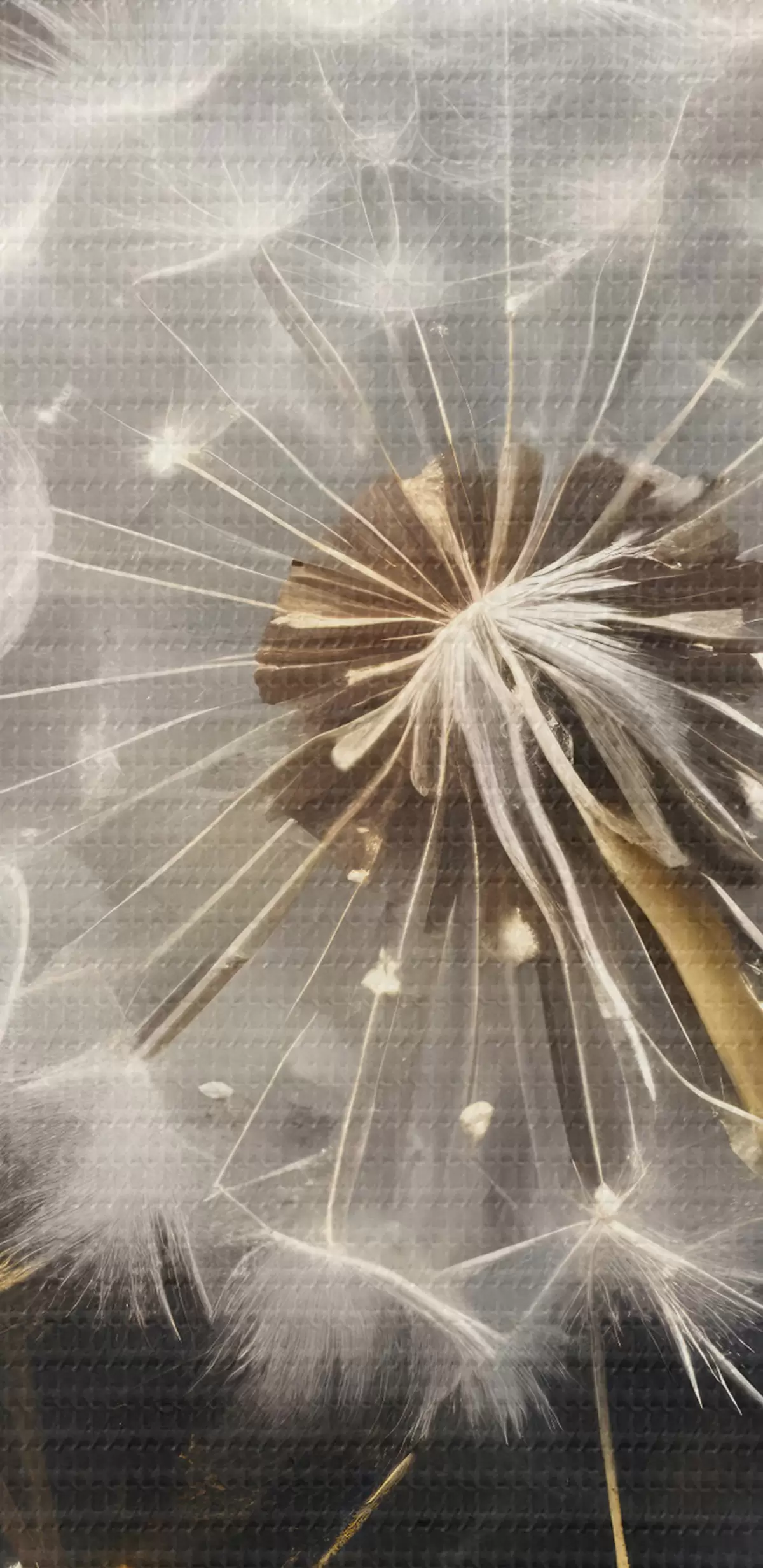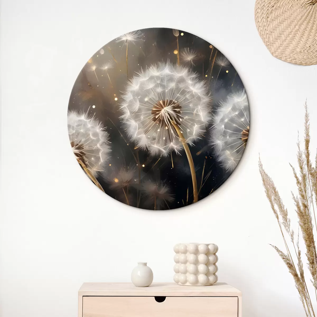 Ronde schilderijen Paardenbloemen met hun pluizige witte zaadhoofden tegen een donkere achtergrond, waardoor een magische sfeer ontstaat Nr r42235