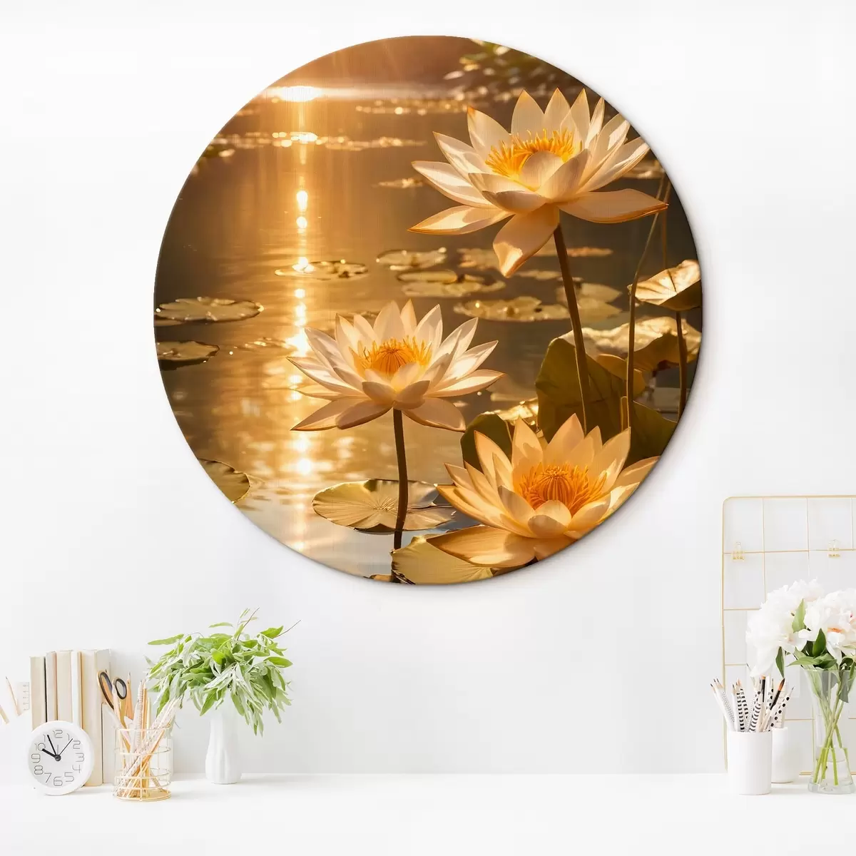 Ronde schilderijen Witte lotusbloemen drijven op een kalme vijver met de zon, waardoor een serene en rustige sfeer ontstaat Nr r42239