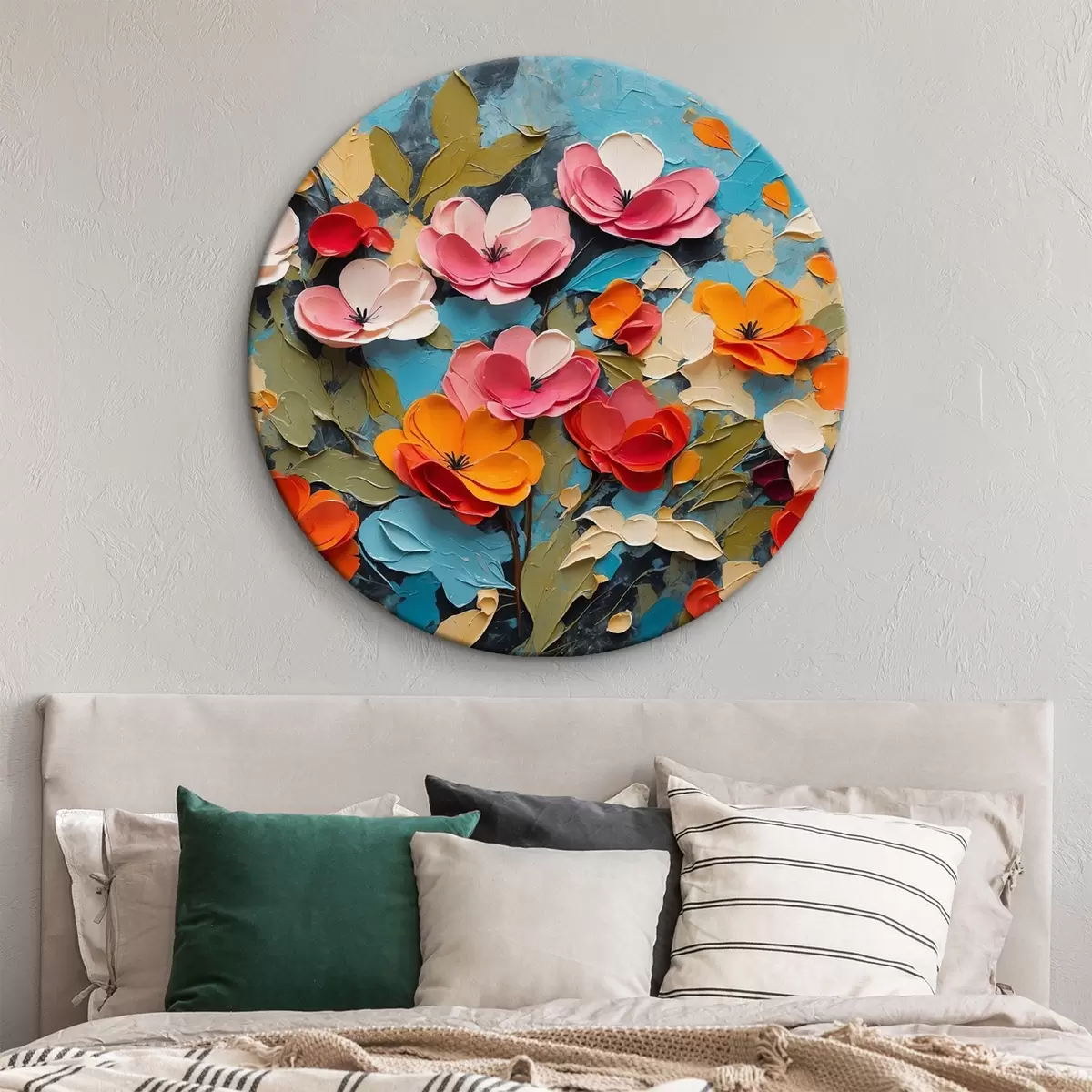 Ronde schilderijen Bloemen en bladeren op blauwe achtergrond Nr r42255