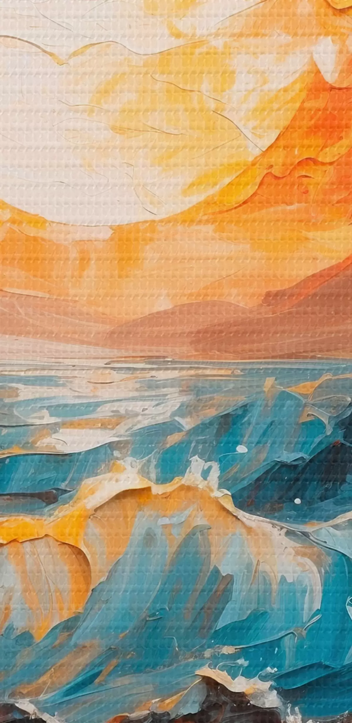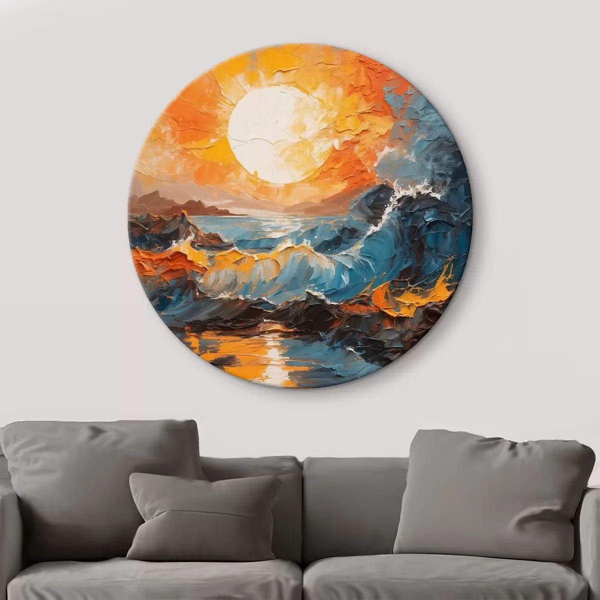 Ronde schilderijen Stormachtige zee en zon in olieverfschilderijstijl Nr r42257